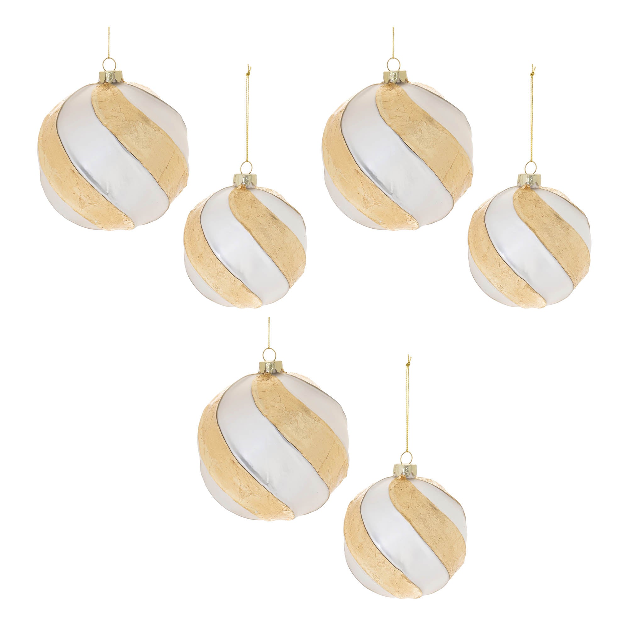 Elevate your holiday decor with this set of Distressed Glass Ball Ornaments. Featuring festive gold and silver tones with metallic touches, these ornaments bring a modern touch to your seasonal displays. The traditional ball shape is beautifully enhanced by a swirled pattern and distressed finish, giving each ornament a unique, textured appearance. With a gold ornament cap and delicate string hanger, this set of 6 ornaments add an elegant yet contemporary flair to your Christmas tree, wreath, or garland, making them perfect for creating a statement in your holiday decor.