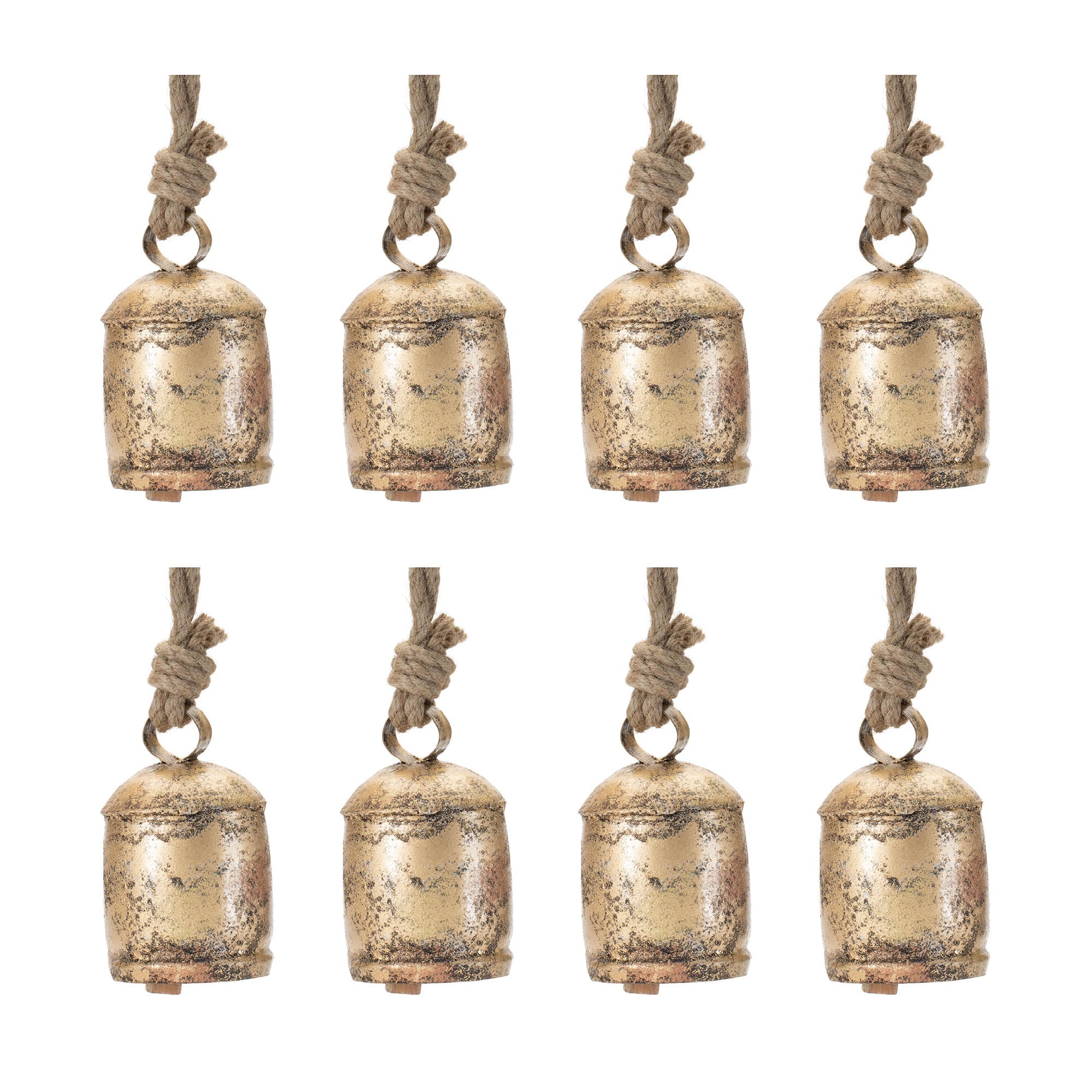 Bring rustic elegance to your holiday decor with these Distressed Metal Bell Ornaments. Featuring a festive gold tone with a natural wooden clapper and distressed finish, these bells offer a perfect blend of modern and rustic charm. The jute rope hanger adds a natural touch, making them ideal for hanging on your Christmas tree, wreath, or mantle garland. Sold in a set of 8 matching pieces, these ornaments are designed to make a statement in your farmhouse-themed holiday displays, spreading cheerful, rustic holiday spirit throughout your home.