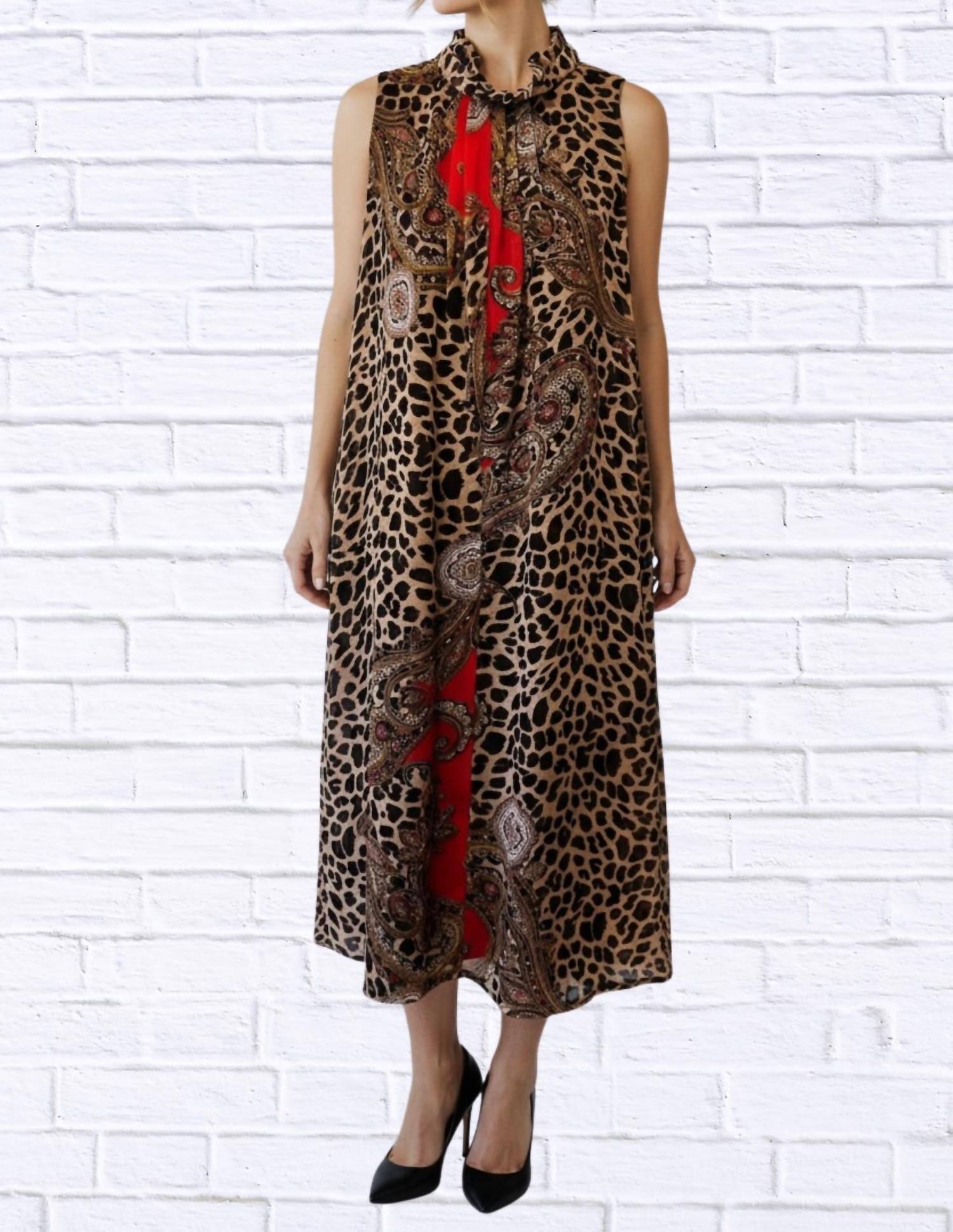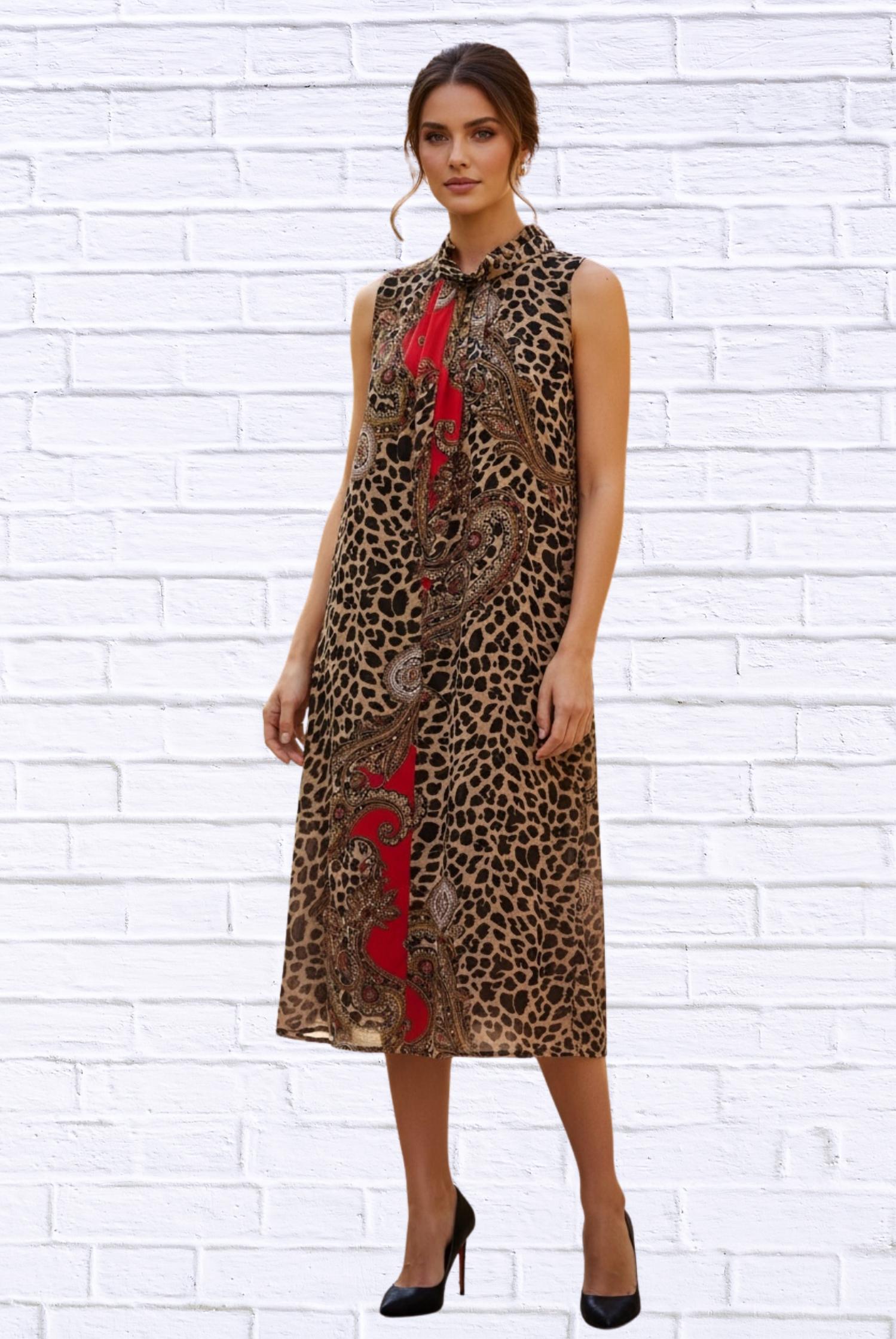 Just add slides or mules and you are good to go. Embrace a bold look with the Print Sleeveless Maxi Dress by Diva USA, a captivating piece designed for women. This maxi dress features a sleeveless cut and a high neckline with a feminine bow tie detail. Made from lightweight woven fabric, it boasts a striking animal and paisley mix print with bold red accents, exuding wild elegance. Machine wash.