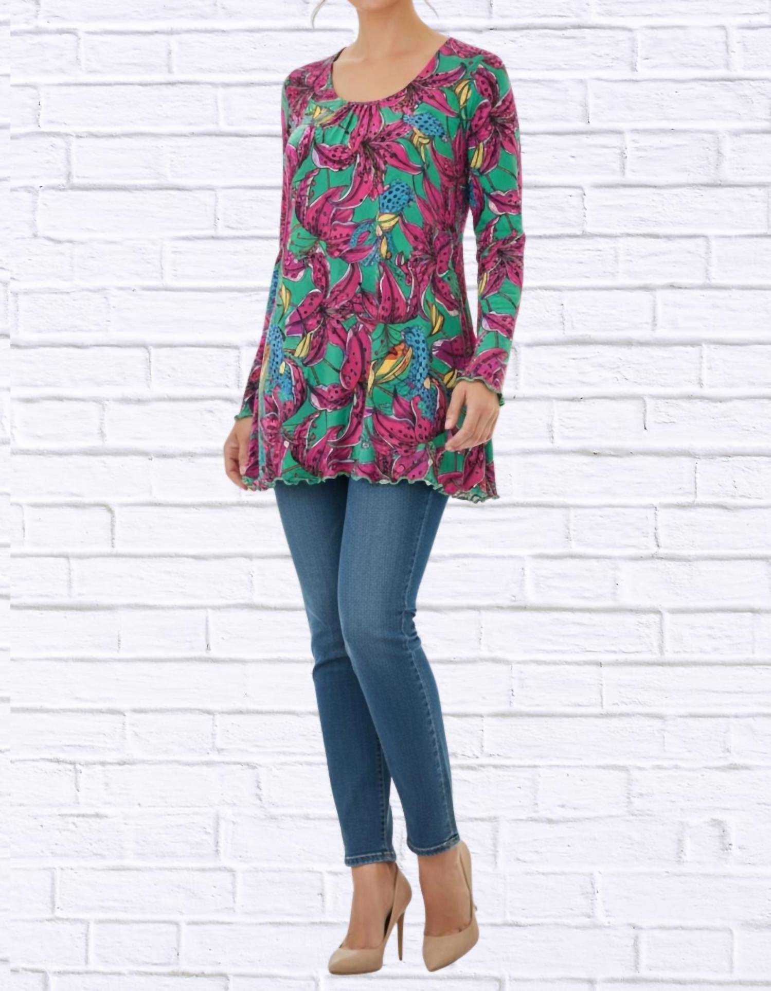 Introducing the Sibella Pleated Front Long Sleeve Blouse by Diva USA, a chic addition to your fall wardrobe. Crafted from 100% knit polyester, this floral cheetah print blouse features long sleeves and a squared V-neckline with elegantly draped pleats. Pull On. Machine wash.