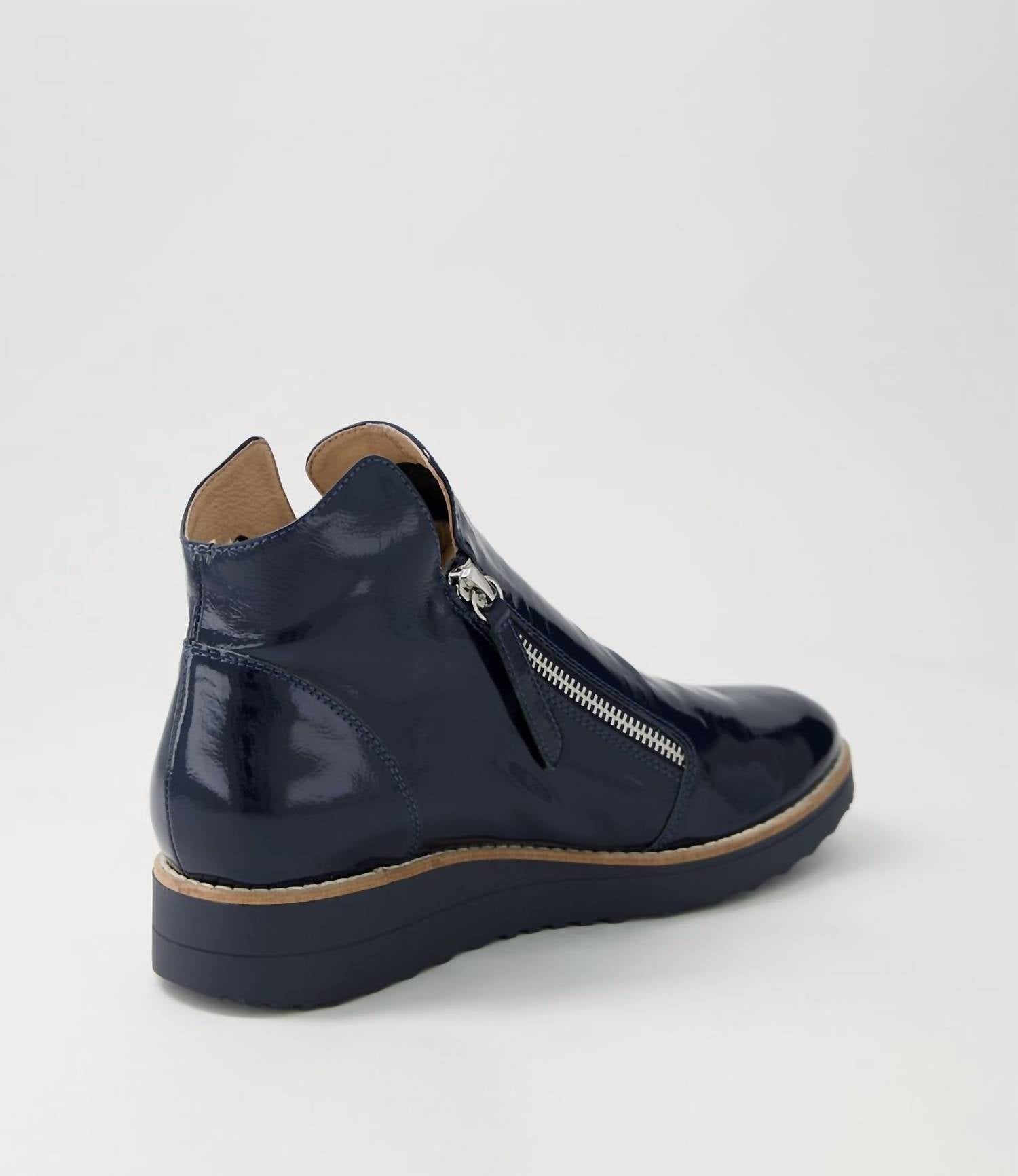Elevate your casual footwear collection with the Women's Ohmy Leather Ankle Boots by Django & Juliette, crafted in rich navy leather. These high-top boots feature a round toe and twin-zip fastening for a snug fit, complemented by a 1.18-inch foam wedge sole that adds a sporty touch. With a stylish patent leather finish, these ankle boots are designed for both comfort and style. Perfect for any occasion, they are an effortless addition to your wardrobe.