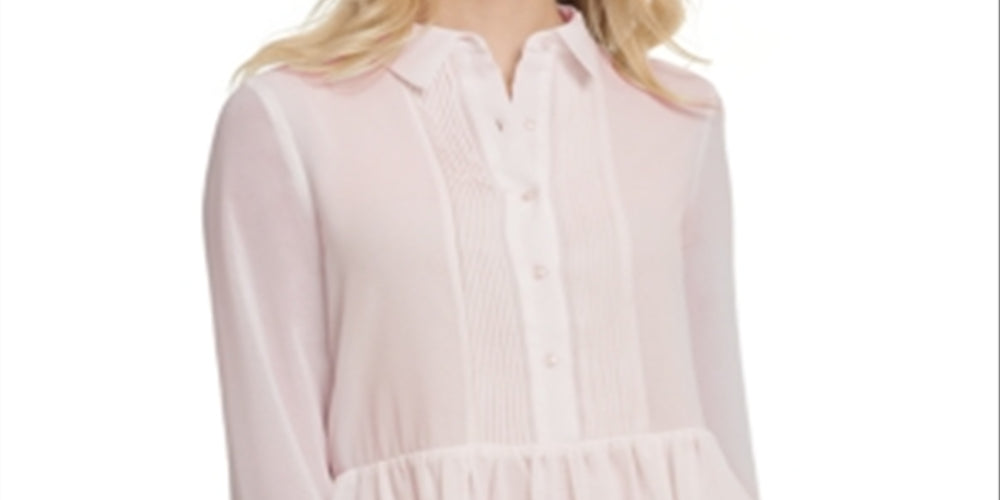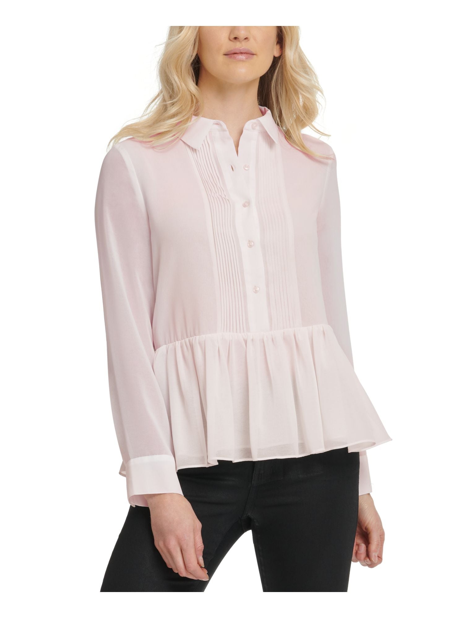 DKNY Women's Button up Long Sleeve Collared Pink Top L