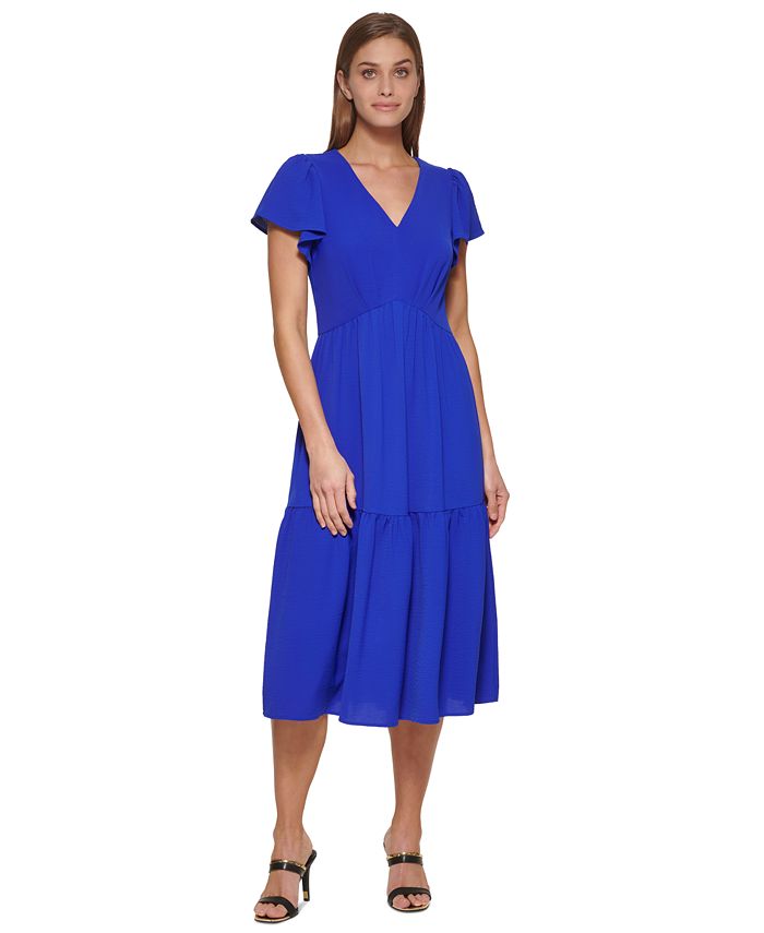 Cut to fall elegantly against the body| this V-neck DKNY petite dress boasts a tiered skirt that promises modern grace with every poetic step. | Approx. 42-1/2 long from center back neck to hem. Length is based on size 6P and varies 1/4 between sizes| Falls below the knee to lower calf| Round neckline; Midi silhouette | Hidden back zipper