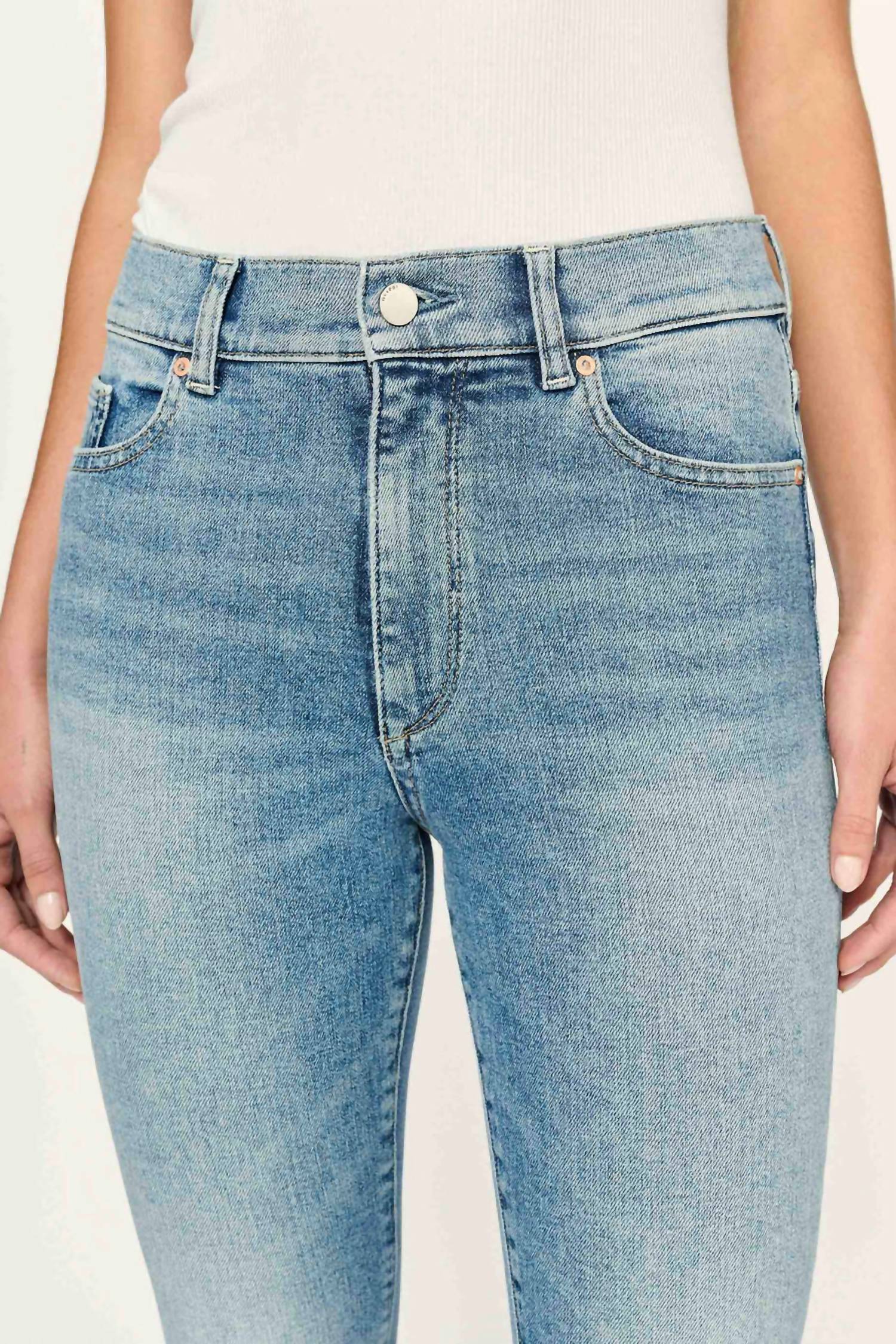 High-waist is here to stay and we especially love this style. Introducing the Bridget Boot High Rise Crop Jean by DL1961, a stylish addition to any wardrobe with its relaxed bootcut leg style and high-rise waist. These jeans come in a solid Aged Mid color, featuring a medium wash for a vintage, worn-in look, accented with brushed silver and matte copper details. Designed with a button closure, this pair offers functionality with pockets and showcases the brand's signature Instasculpt technology for a flattering fit. Perfect for spring, these jeans are ideal for vacation and streetwear occasions.