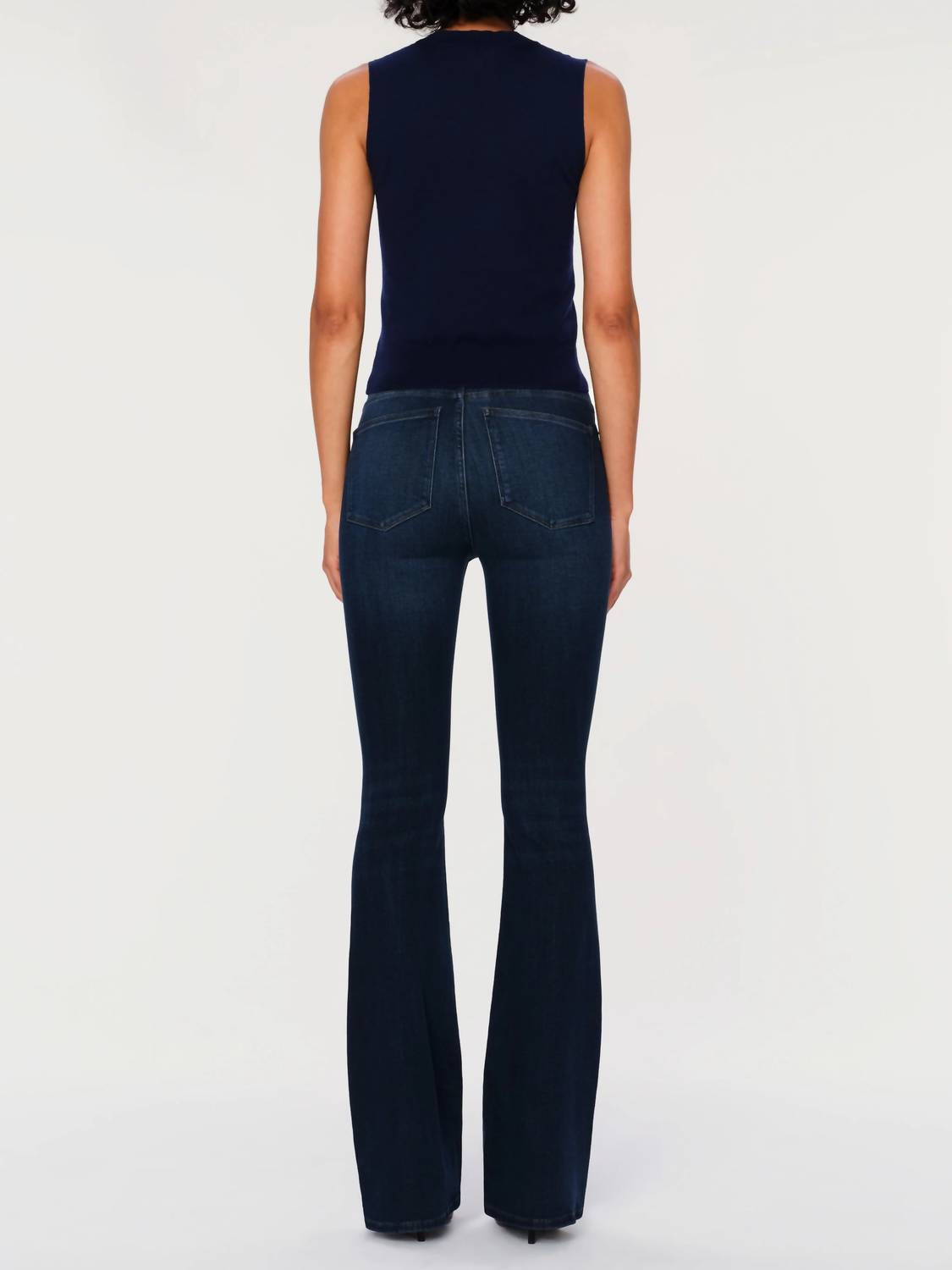 If you're looking for boot-cut, this is the jean for you. Combines style and function. High-rise bootcut jeans feature an innovative Instasculpt technology for a flawlessly smooth fit. With a composition of 62% Tencel Lyocell, 23% Cotton, 14% Polyester, and 1% Lycra. Offer comfort and durability in a chic dark indigo color, complemented by brushed gold hardware. Button closure adds a classic touch. Recommend washing separately and ironing on medium heat for longevity. Tailored fit with a 10” rise, 33” inseam, and 17” leg opening.
