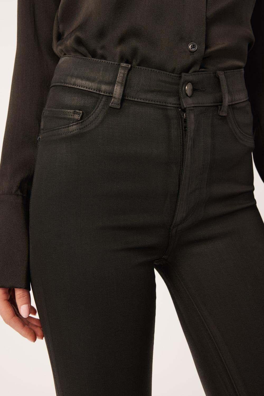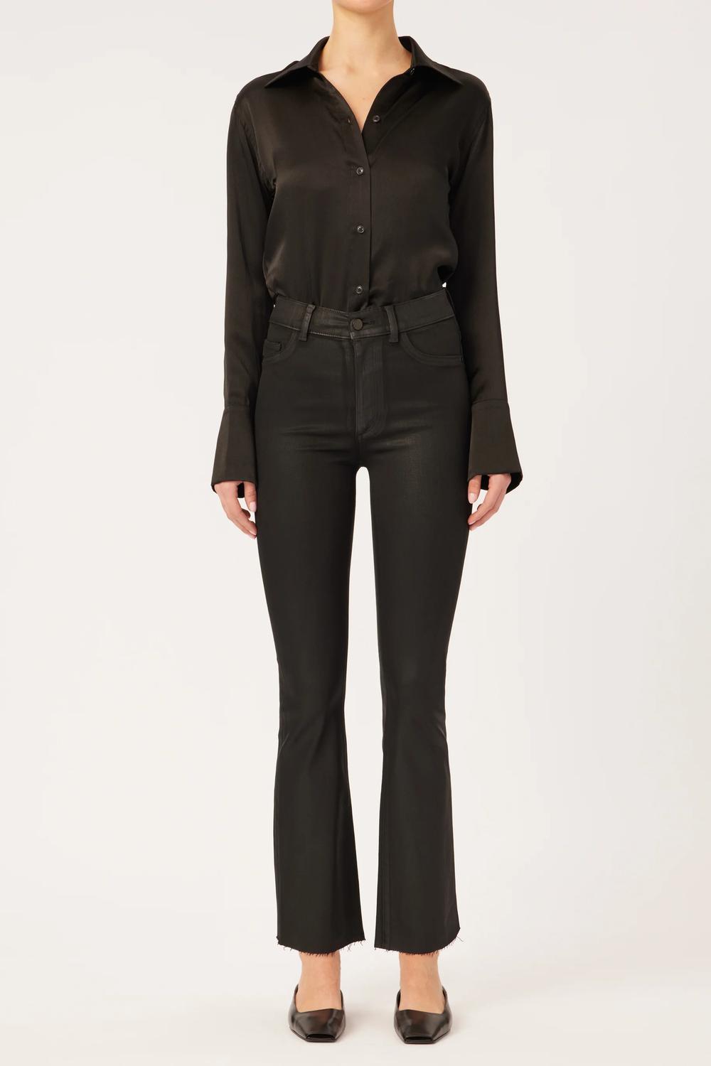 Just add boots! Introducing the Bridget Crop Bootcut Jeans in Black Coated by DL1961, a chic addition to your wardrobe with its high-rise design and relaxed bootcut leg. Crafted from solid black coated denim, these jeans offer a luxurious leather-like appearance while ensuring comfort with ample stretch. Detailed with faux front pockets, tonal stitching, and black oxide hardware, it features a zip closure for secure wear. Specifications: Rise: 10", Inseam: 27", Leg Opening: 17.25". Care: Machine wash and tumble dry. Perfect for workwear and vacation styling.