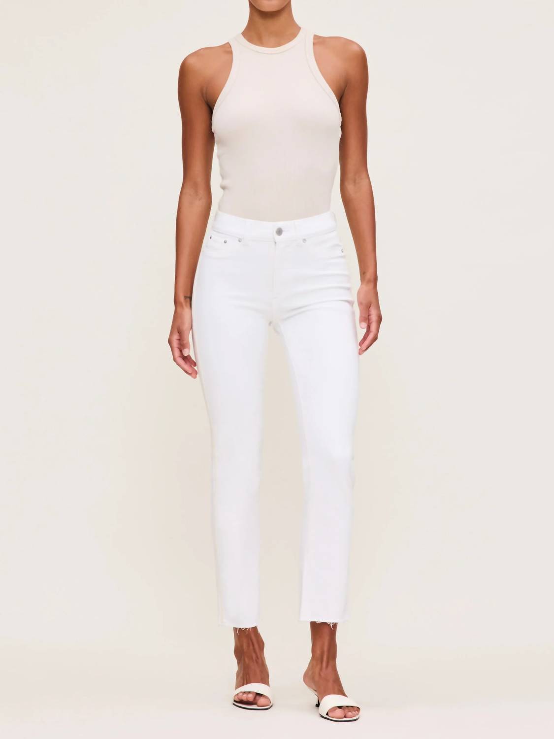 Pair these straight leg jeans with flats, sandals or even heels! You can't go wrong. Discover the Mara Straight Mid Rise Instasculpt Ankle Jeans by DL1961, a chic addition to your wardrobe in the fresh White Stripe pattern. These jeans are crafted from a cotton blend, featuring 98% cotton, 1% Elasterell-p, and 1% Lycra, ensuring a comfortable and flexible fit. Designed with a high-rise contour waistband and a zip closure, they boast ankle-length straight legs adorned with ecru twill tape on the side seams and a raw hem finish. Simply machine wash and hang to dry for easy maintenance, making them perfect for a minimalist look at any spring occasion, from dinner parties to holiday gatherings.