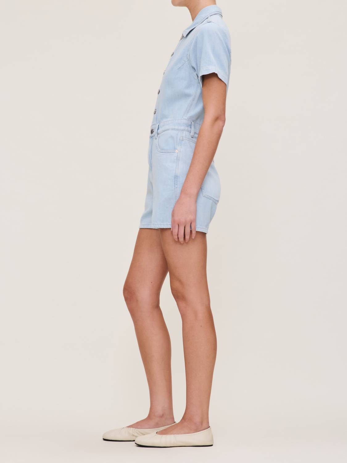 The perfect outfit choice when you you need something quick to throw on and still want to look efforlessly cool. This short sleeve romper is designed in an ultra-light indigo wash, Poolside, exuding an authentic worn-in look. Complete with silver shanks, copper rivets, a clean hem, and a button front closure, it offers a convenient blend of style and functionality. Care for this piece by following machine wash instructions for long-lasting wear. 69% Cotton, 31% TENCEL™ Lyocell.
