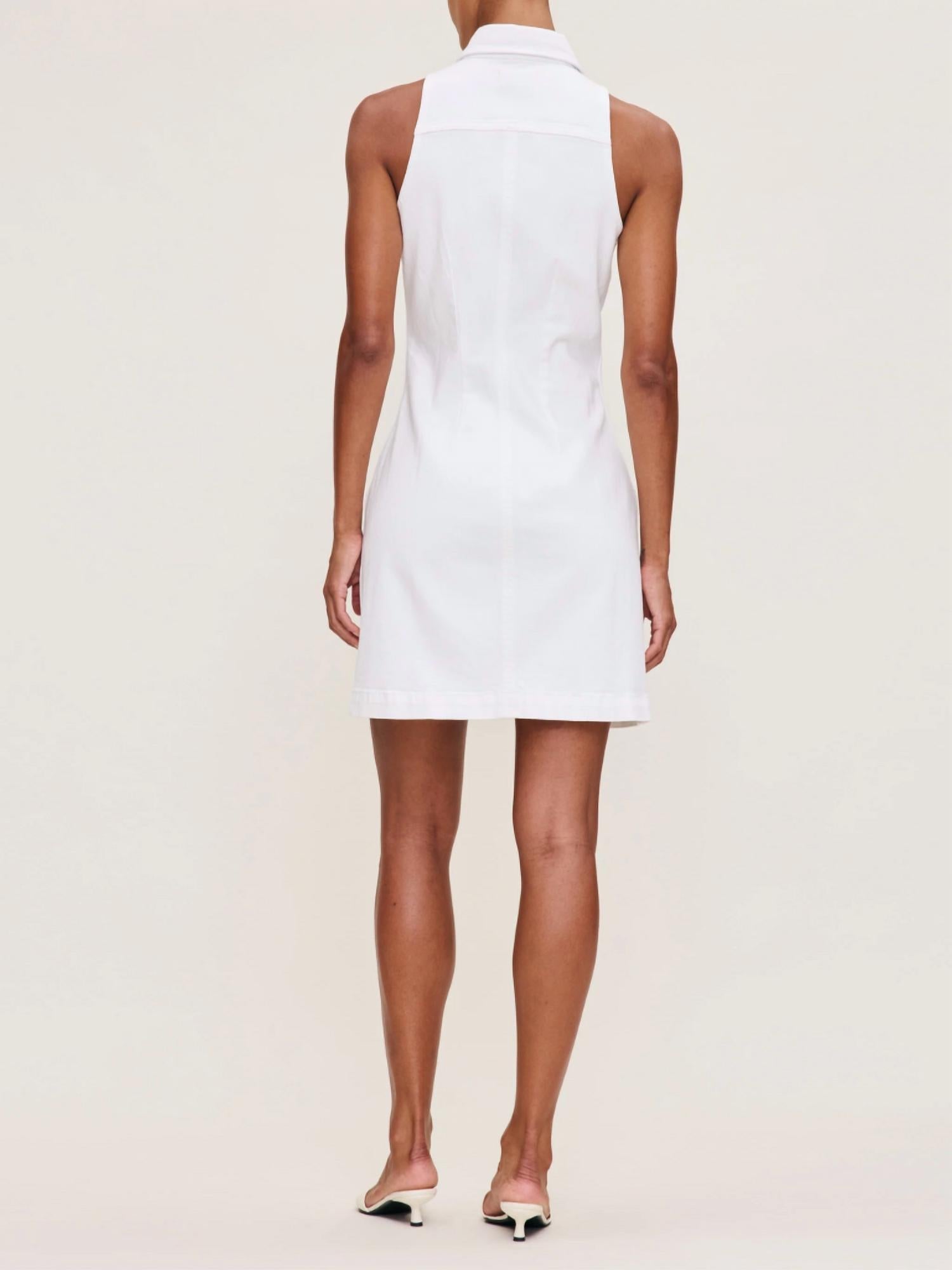 A short and breezy dress for those warmer days. Introducing the Payton Mini Dress by DL1961, a chic sleeveless piece perfect for a minimalist spring wardrobe. Crafted from a 99% cotton and 1% lycra blend, this tailored shift dress features a point collar and a sleek front button closure. The white denim fabric is accented with silver hardware and tonal stitching, offering a fresh and clean look. Care: Machine wash. Ideal for evening events or Easter celebrations, this dress runs true to size with low stretch.