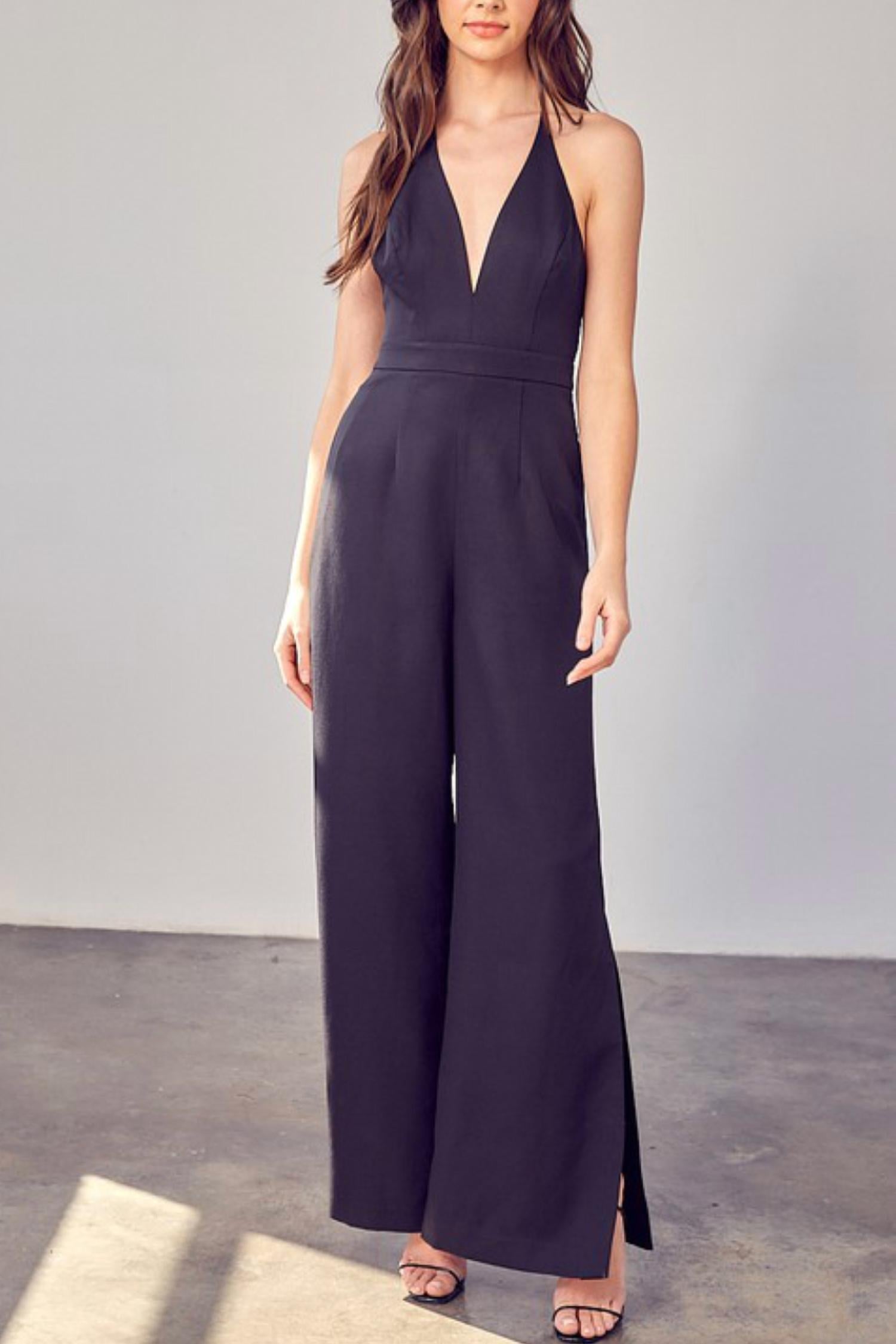 It doesn't take much for this one piece to look effortlessly cool. Add some statement jewelry to dress it up, or throw on some sneakers for a more casual vibe. Turn heads at your next dinner party with the Halter Jumpsuit by DO+BE, designed for chic minimalism in a solid black hue. This women's jumpsuit features side slit hems, offering a hint of drama, while the high-waist, wide-leg, relaxed fit ensures comfort and style. Crafted from a blend of 92% Polyester and 8% Spandex with a 100% Polyester lining, it includes on-seam pockets for practicality. Closure: Invisible zip and tie-neck.