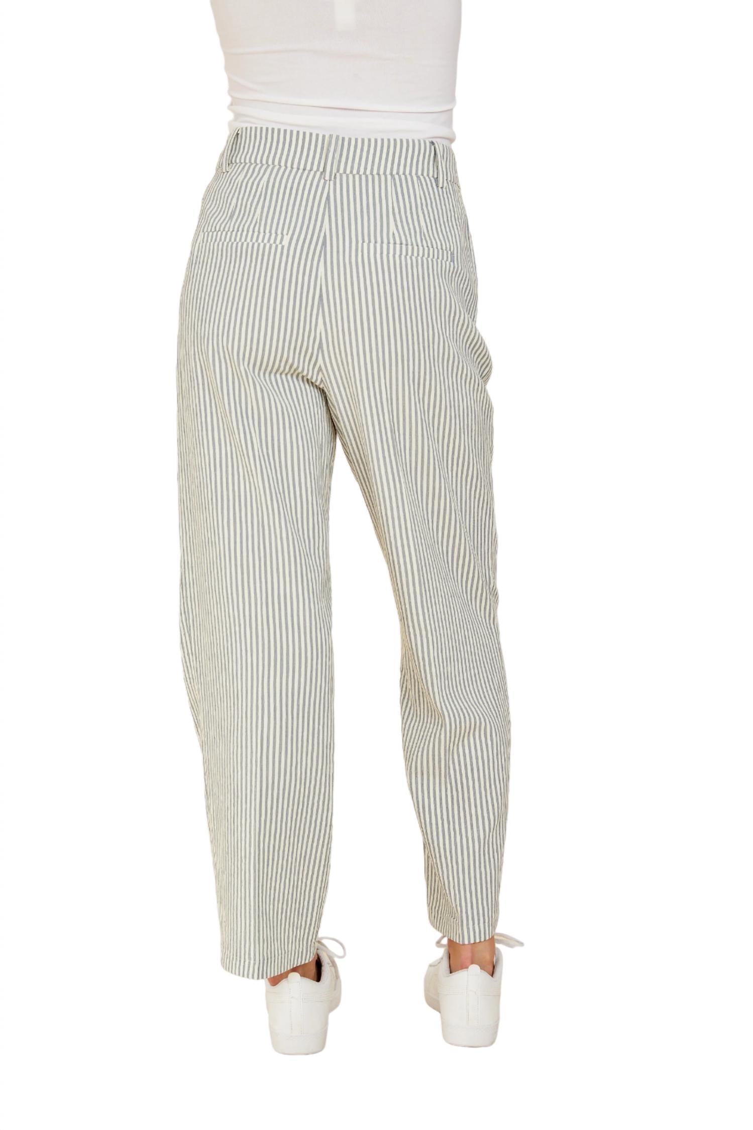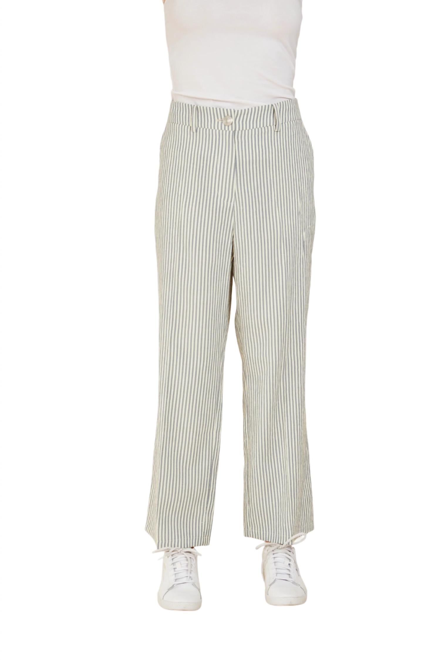 A straightleg pant that workes season after season. Dress these up with your favorite blouse or keep it casual with your go-to tee.Straight leg. Ankle length. Seer sucker stripes. Runs large. True to size. Model is 5 9” wearing size S. Dry Clean Only.