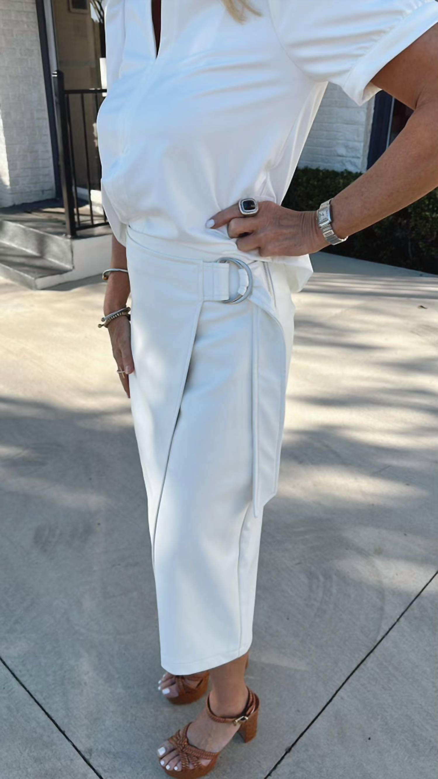 Tuck your favorite tee into this midi length skirt for an effortlessly cool look. Add a touch of rebellious elegance to your spring wardrobe with the DOLCE CABO Vegan Leather Wrap Skirt in White. With its sophisticated midi length and wrap-around design, this piece is perfect for any occasion, featuring a sleek side buckle. Crafted from chic faux leather, it offers a bold statement while staying animal-friendly. Closure: Side Zipper. Care: Dry clean only.