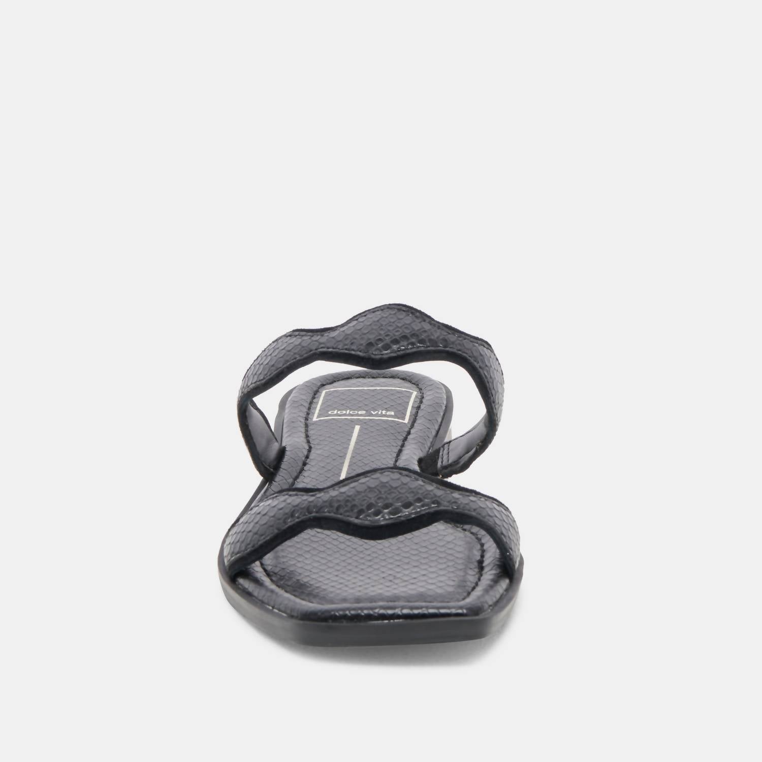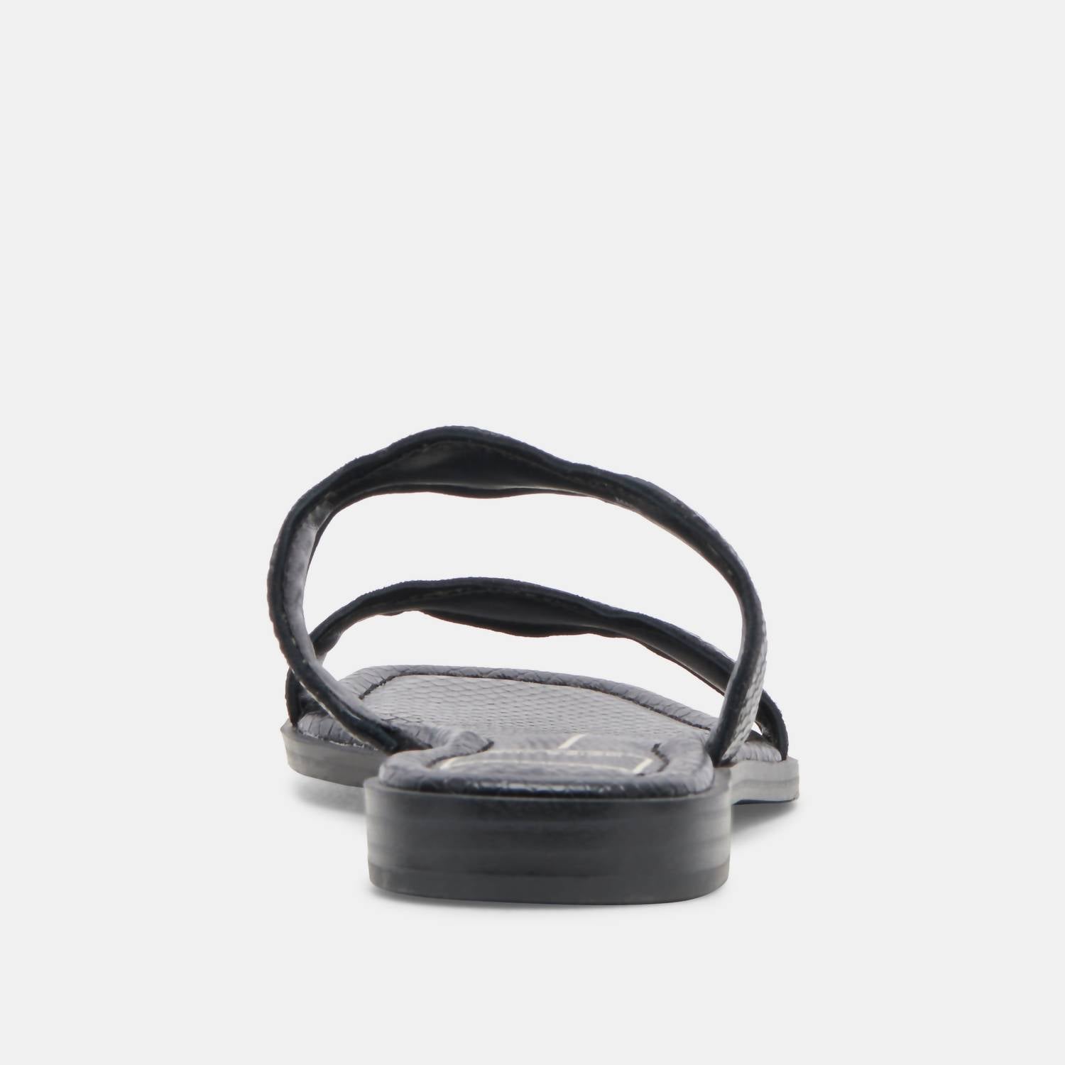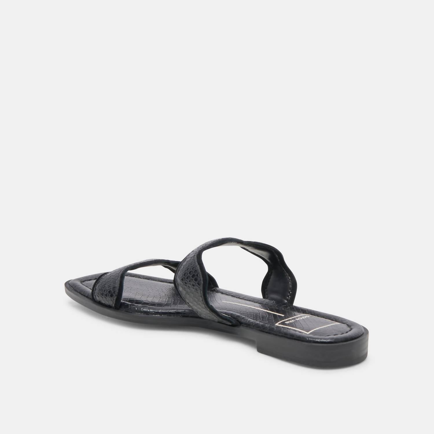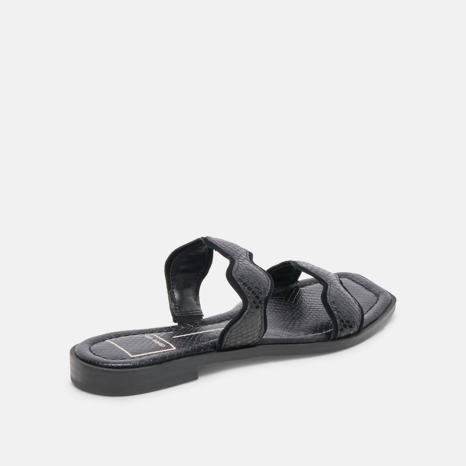 A preppy yet feminine take on the classic loafer. Discover the Women's Ilva Low Sandals by Dolce Vita in striking Onyx Embossed Leather, perfect for adding flair to any summer ensemble. These sandals feature an open toe design and scalloped straps for a dressier touch. Crafted with a leather upper and a recycled synthetic outsole, they offer a water-based leather alternative lining and a comfortable flat heel of 0.8 inches. Imported and designed for versatility, these sandals are ideal for travel or making a statement on Mother's Day.