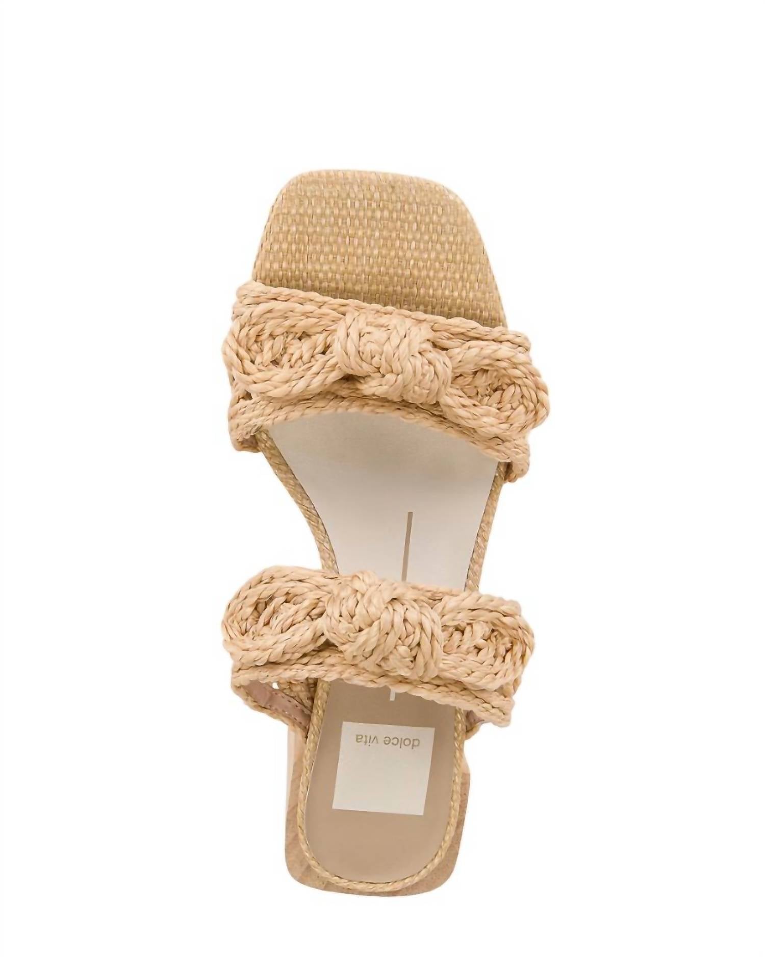 Raffia upper with bow detailing on straps, square toe design, and wooden heel. Faux leather footbed with a manmade sole. Approx. 2.25" Heel height. Slip-on styling for easy wear.