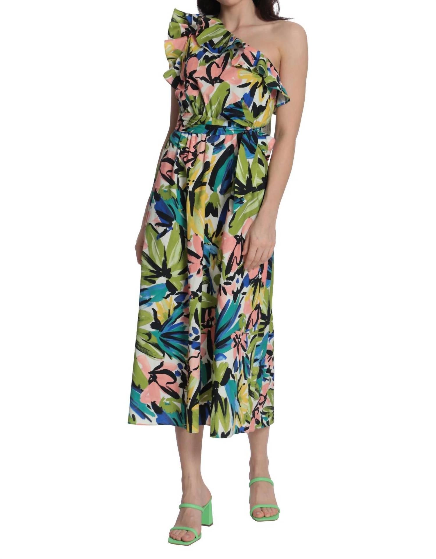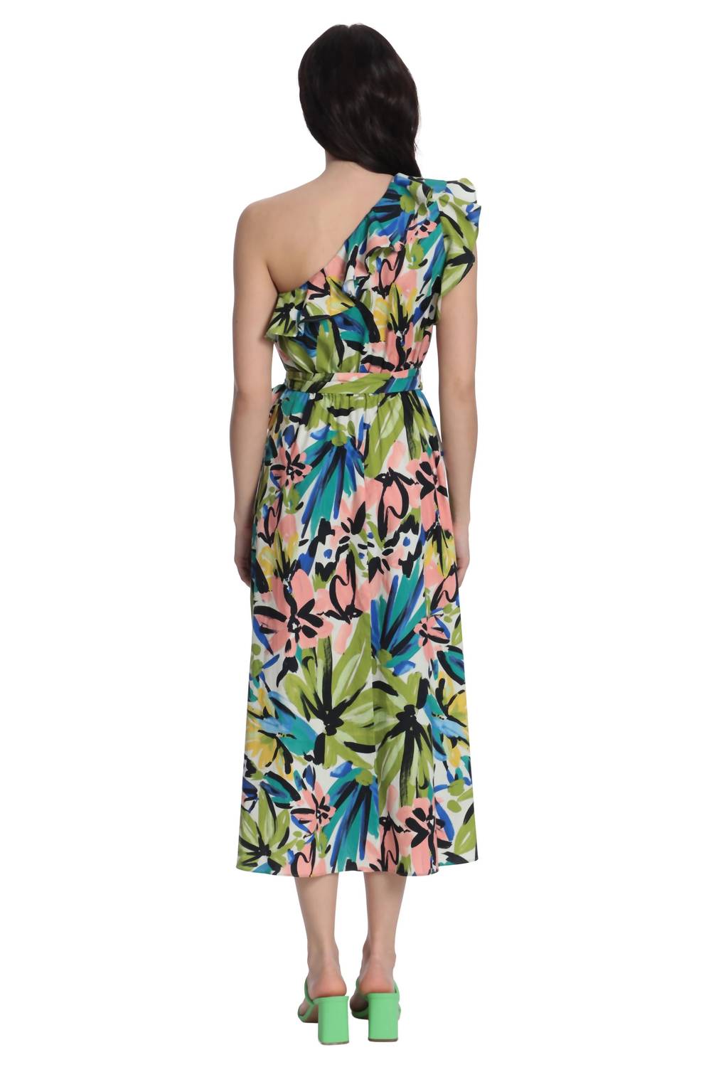 A midi dress so versatile, your options for wearing it are endless. Elevate your summer wardrobe with the Floral One Shoulder Midi Dress by Donna Morgan, a perfect choice for vacationing in boho-chic style. This sleeveless dress features a delightful watercolor floral pattern and playful ruffles, rendered beautifully in an olive green cotton blend with 97% cotton and 3% spandex for comfortable wear. Care is simple: machine wash and lay flat to dry. Stay stylish with its fit and flare silhouette and off-the-shoulder neckline, a fresh staple for any warm-weather occasion.