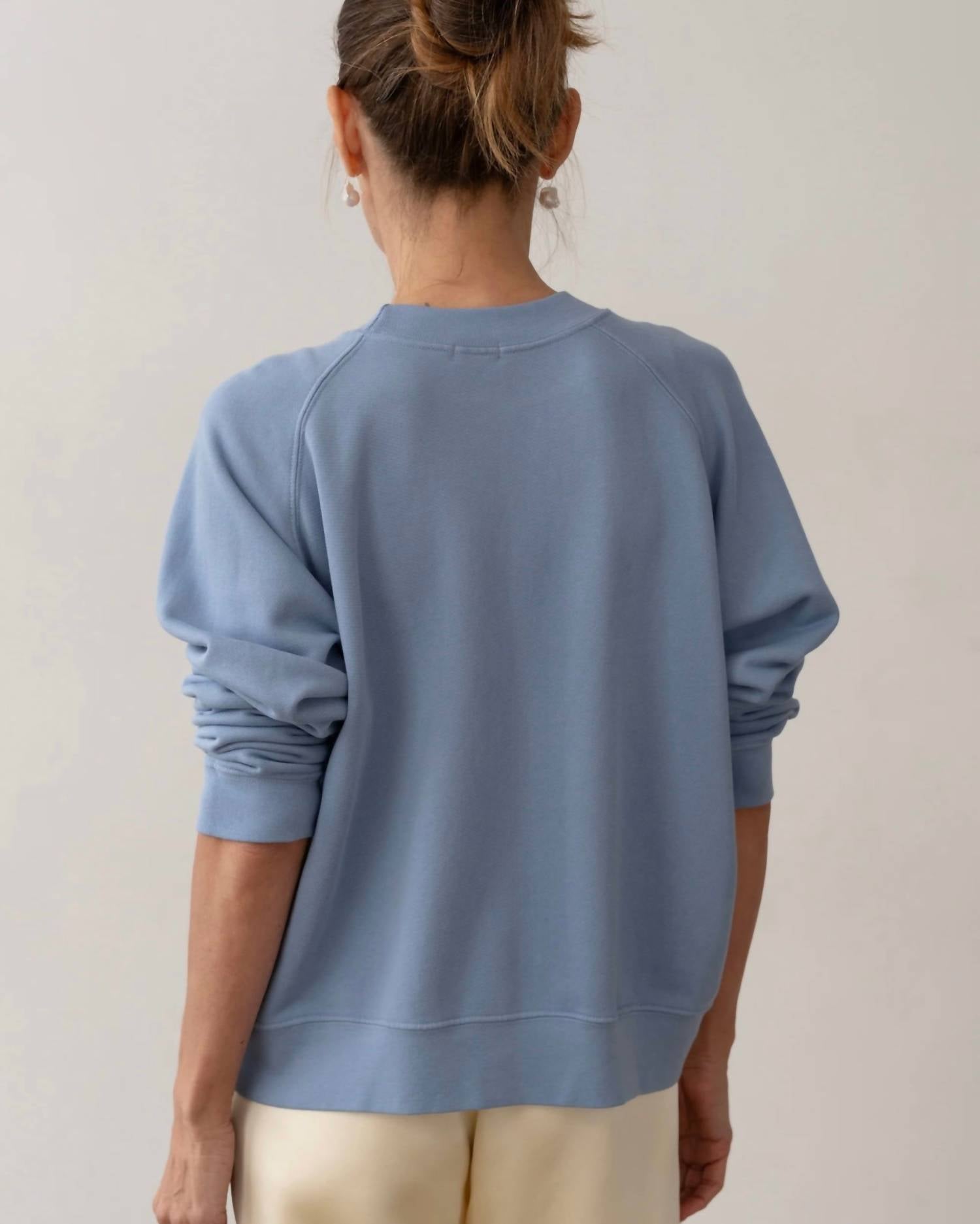 Cozy fabric, impeccable design - Meet the sweatshirt that you'll never want to take off. Introducing the Eco-Terry Crewneck Sweatshirt by DONNI., a minimalist must-have for your fall wardrobe in cornflower blue. Crafted with long sleeves from 100% organic cotton sourced as a cozy cotton blend, this sweatshirt boasts an ultra-soft and naturally lived-in feel. Designed in Los Angeles with a classic crew neckline and solid pattern, it is a timeless travel companion for Thanksgiving and beyond. Closure: Pull on. Care: Machine wash cold on a gentle cycle with like colors, do not spot treat, no bleach, tumble dry low.