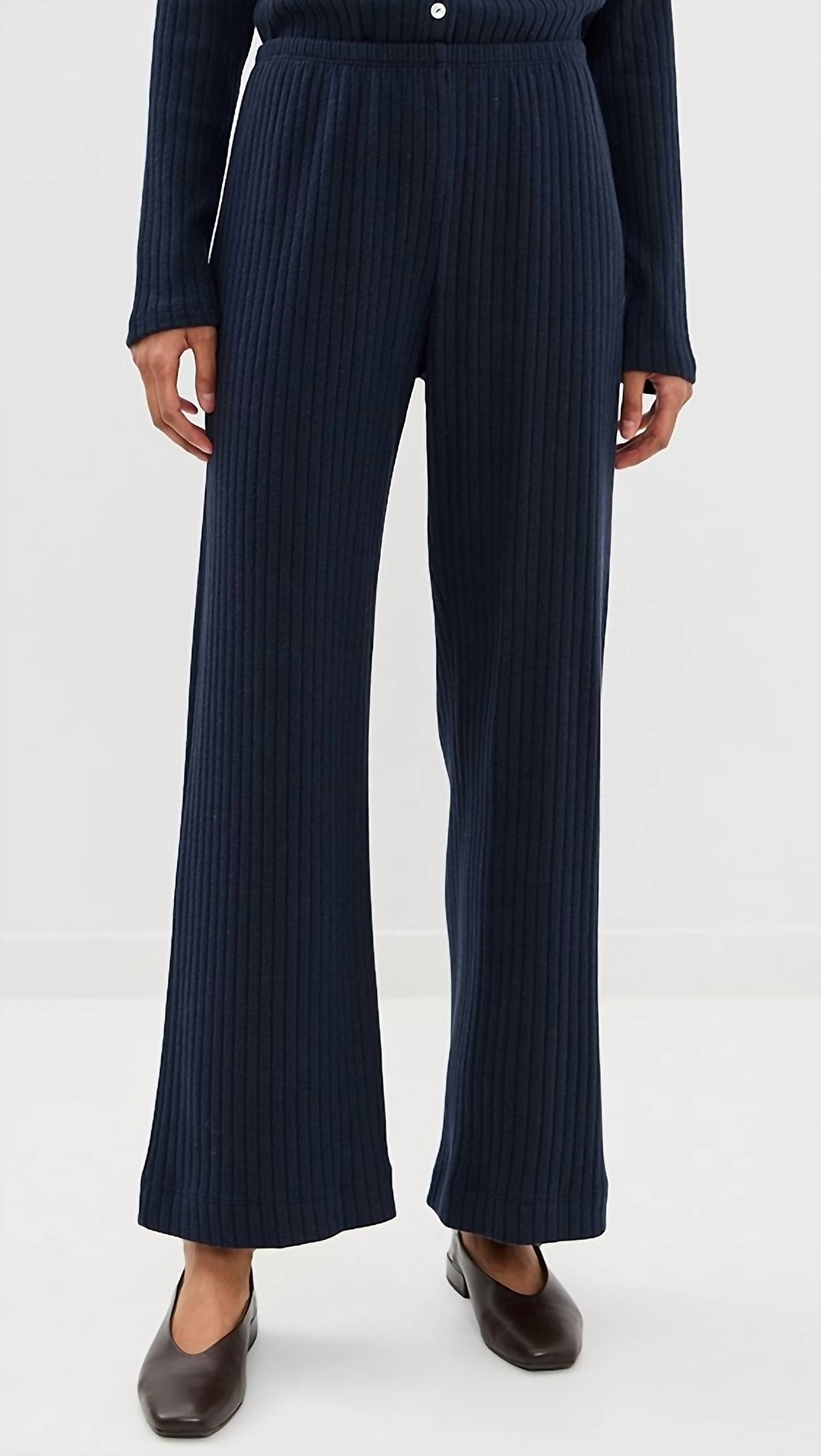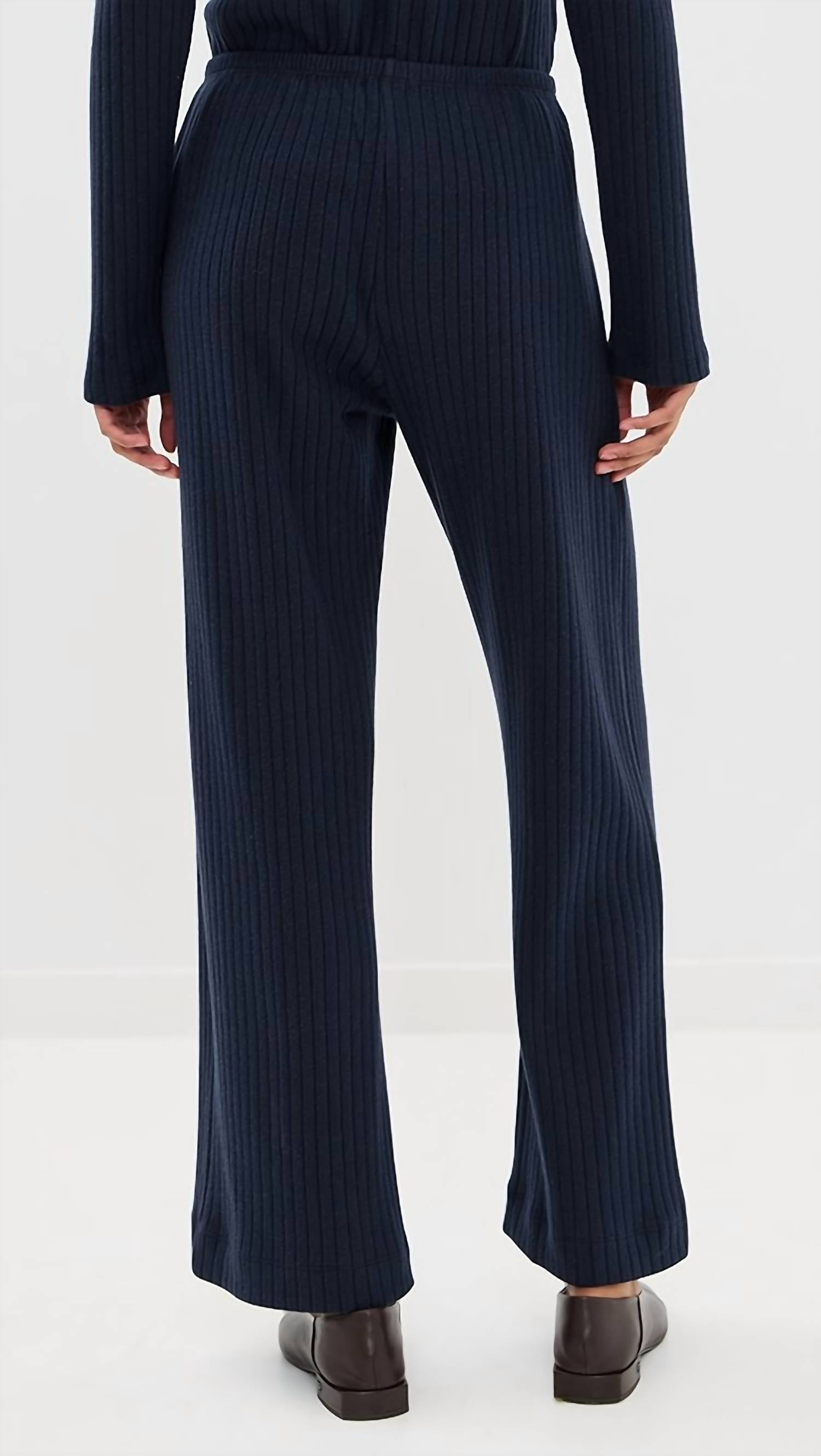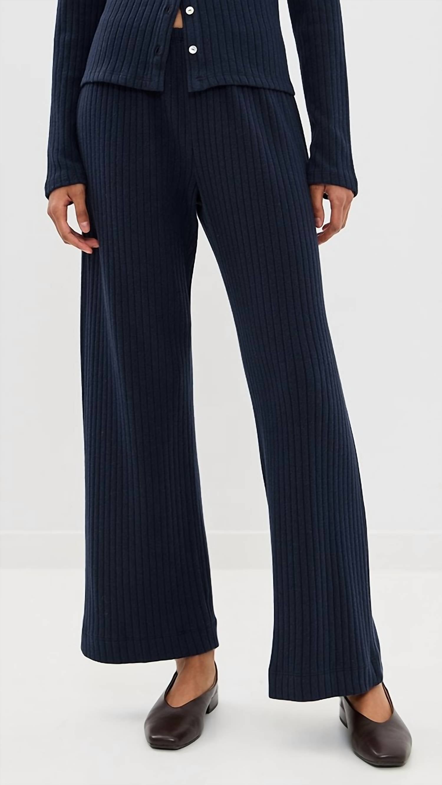 A perfectly tailored straight leg that you'll want in every color! Elevate your fall wardrobe with the Sweater Rib Simple Pants by DONNI, a perfect blend of comfort and style in chic navy. Crafted from a cozy cotton blend with a ribbed texture, these pants boast a mid-rise 10.25" waist and 29.5" inseam for a straight-leg silhouette. Designed for comfort with an elastic waistband and pull-on closure, these minimalist pants are made in Los Angeles. Ideal for a holiday party or Thanksgiving gathering, they're the epitome of understated elegance.