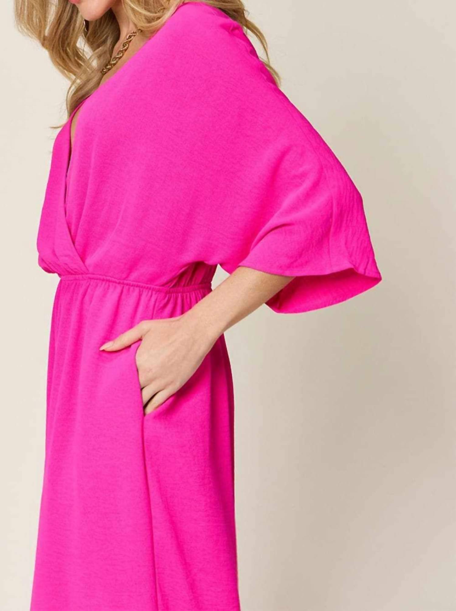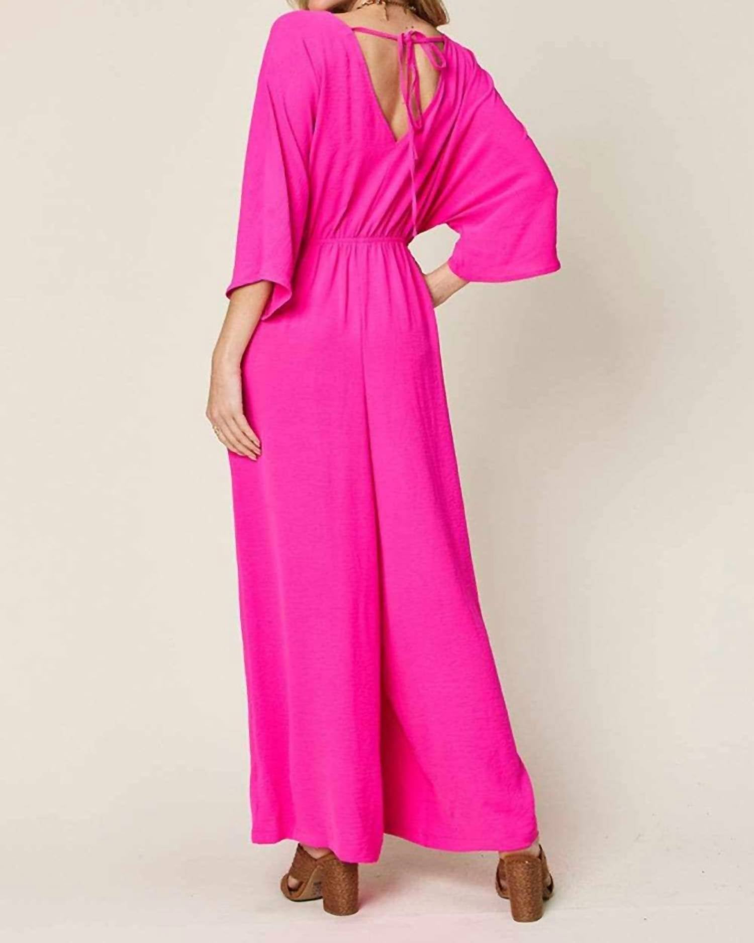 Step out in style with the Chic Surplice Wide Leg Jumpsuit by Double Take, featuring a flattering surplice neckline and a contemporary wide leg fit. Crafted from a soft blend of 95% polyester and 5% spandex, this hot pink jumpsuit offers both comfort and a perfect fit for any occasion. It includes convenient pockets to keep your essentials close and comes with a pull-on closure for easy wear. Care instructions recommend laying flat to dry.