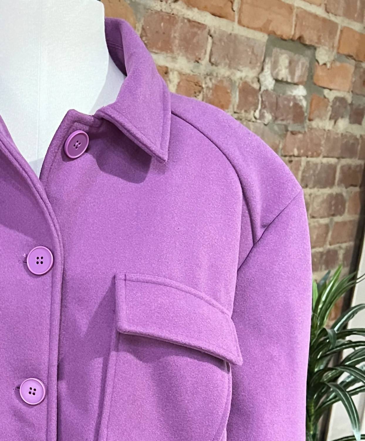 A casual yet cool jacket that every closset needs. Enhance your travel wardrobe with the Princess Diana Jacket by Double Zero, a perfect blend of style and functionality. This women's casual jacket in a striking purple shade features long sleeves and chest pockets for added practicality. It sports a solid pattern with a classic collar and a button closure, ideal for the minimalist trend. Designed for fall, this piece is a chic addition to any ensemble.