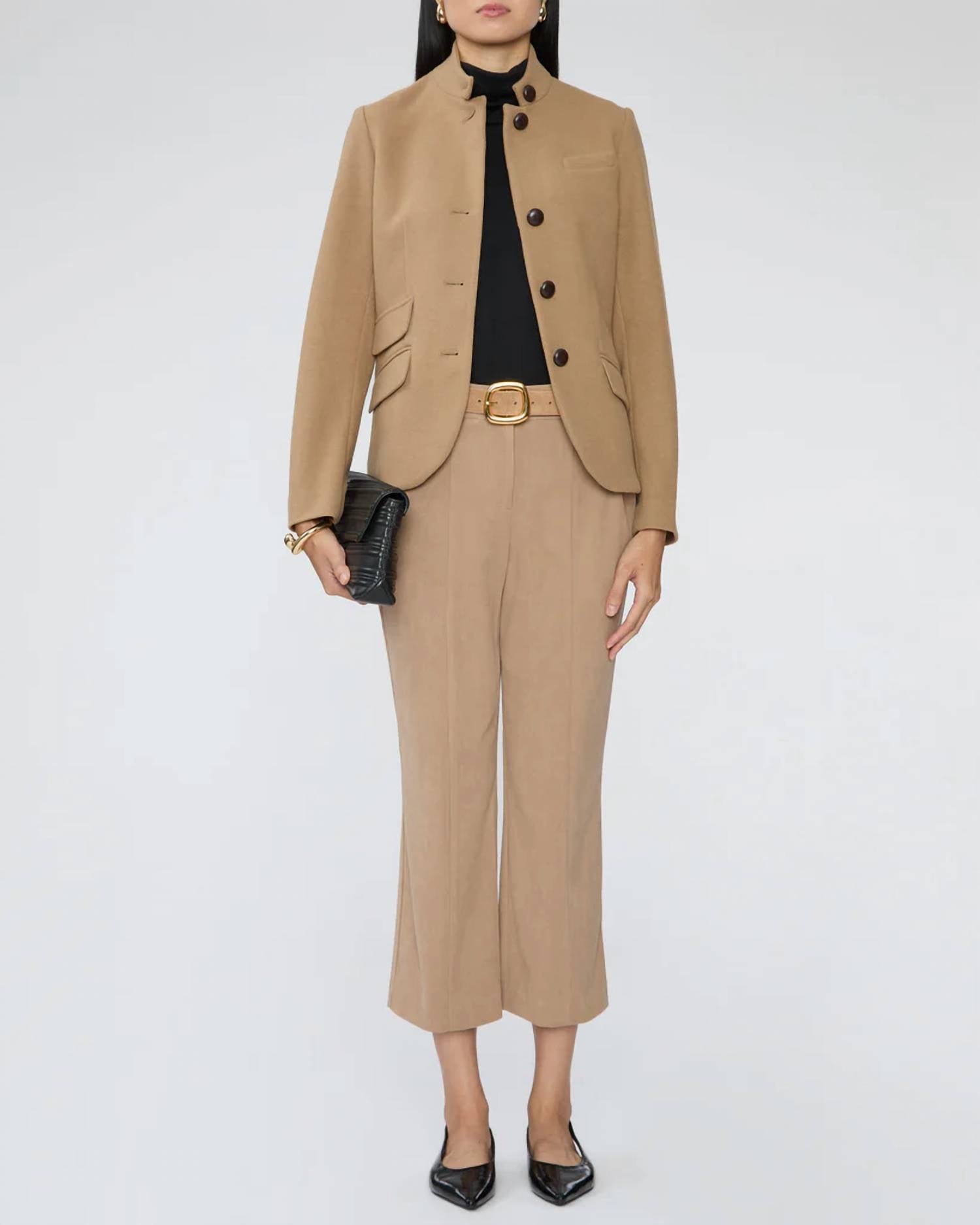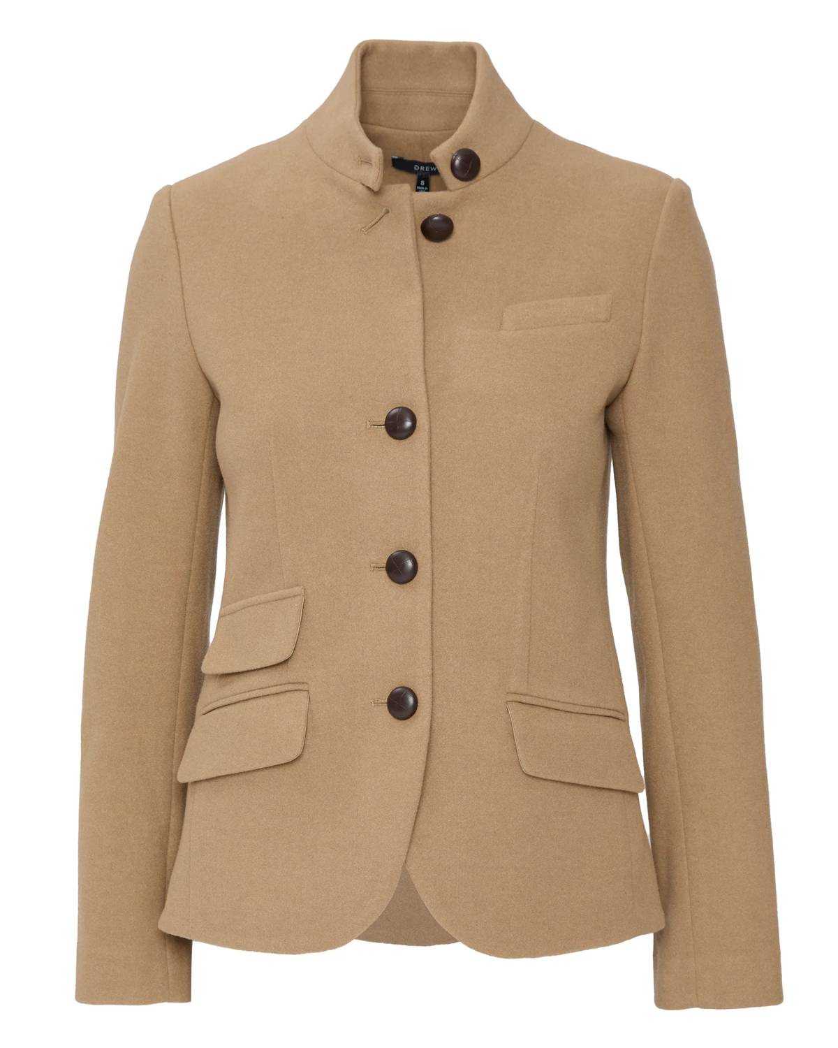 Tailored to perfection, this blazer will be your go-to jacket for years to come. Meet the Jordan Blazer by DREW, a chic addition to your workwear wardrobe in elegant camel color. Designed with long sleeves and a mock collar, this blazer is made from 80% polyester, 10% viscose, and 10% acrylic. It features practical front flap pockets and a sophisticated front button closure, complete with single-button cuffs. Care instructions suggest dry cleaning only, ensuring you wrap the button with foil before cleaning.