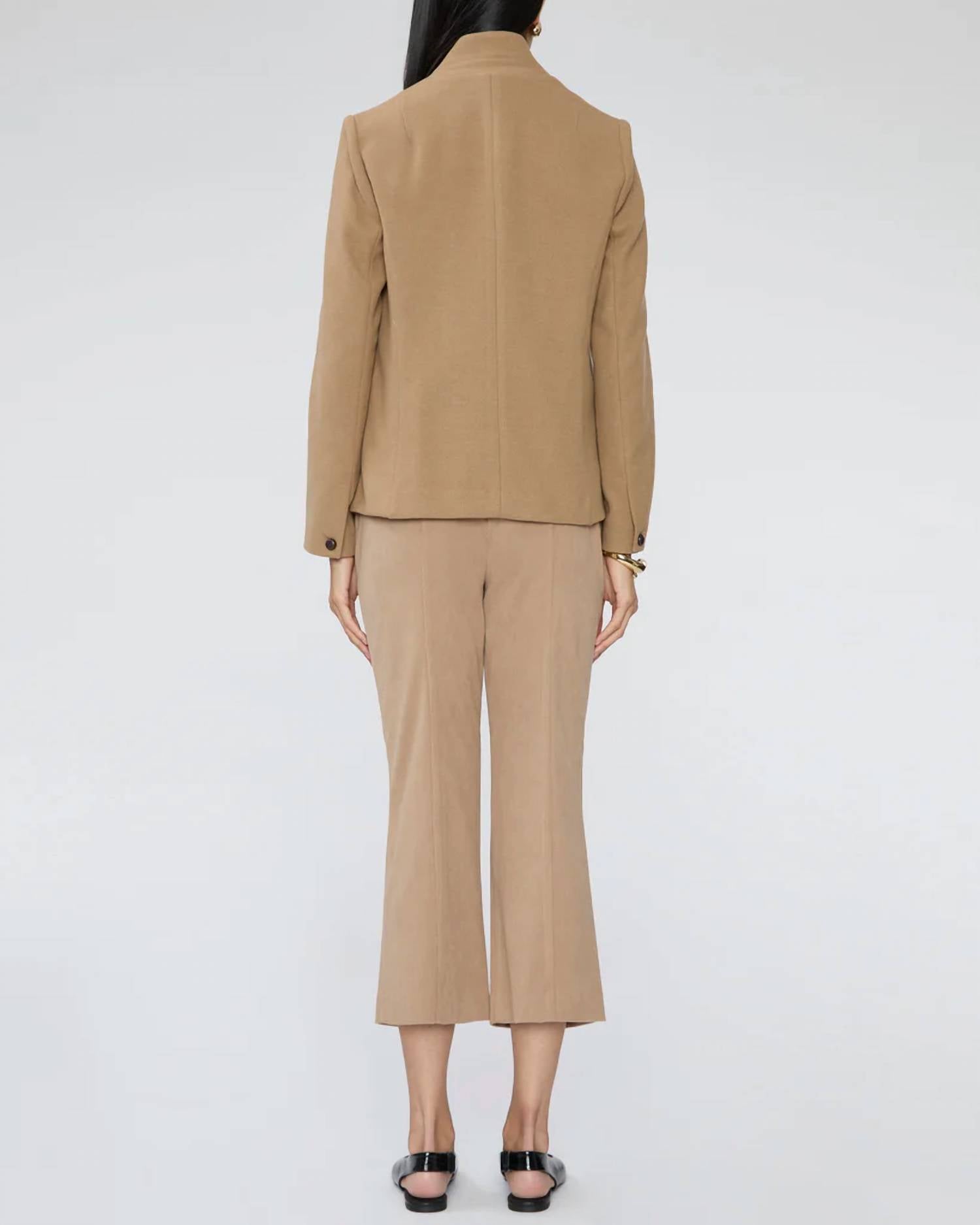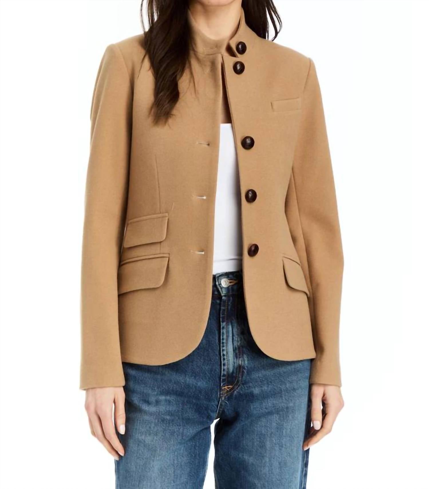 Meet the Jordan Blazer by DREW, a chic addition to your workwear wardrobe in elegant camel color. Designed with long sleeves and a mock collar, this blazer is made from 80% polyester, 10% viscose, and 10% acrylic. It features practical front flap pockets and a sophisticated front button closure, complete with single-button cuffs. Care instructions suggest dry cleaning only, ensuring you wrap the button with foil before cleaning.