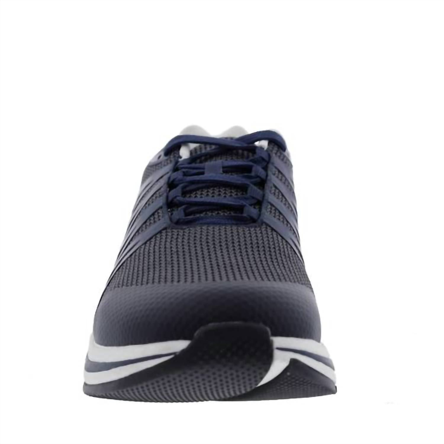 Workout in style with these adorable athletic sneakers. Step into comfort and style with the Women's Player Walk Athletic Shoe by DREW, offered in a sophisticated navy textured design. These athletic shoes boast a fusion of mesh material and advanced Walk Right Technology, ensuring exceptional comfort and support. Featuring a round toe and low flat heel ranging from 1 1/4" to 2", these shoes are tailored for adult wearers who appreciate practical elegance. Equipped with a slip-resistant rubber outsole, a strong nylon shank, and a high rebound EVA midsole, they provide outstanding shock absorption, making them ideal for fitness and workout occasions in the summer season.