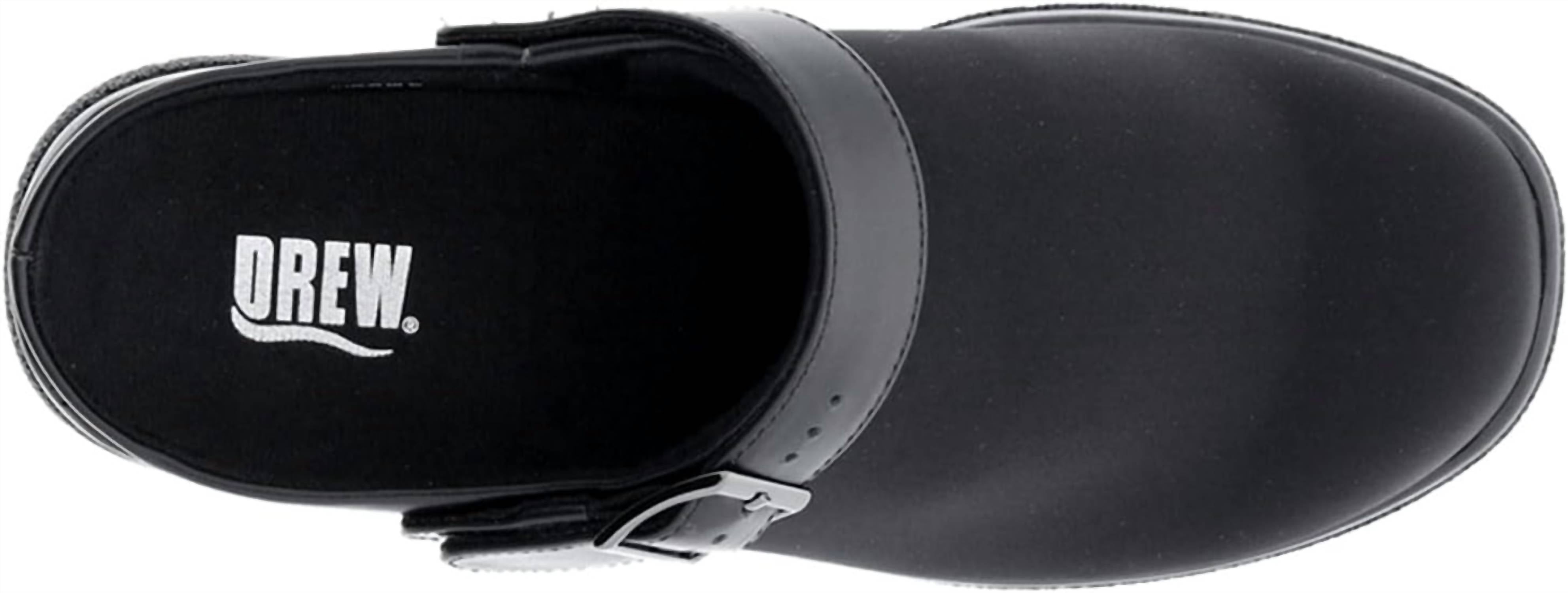 Experience ultimate comfort and style with the Women's Savannah Clogs by DREW, crafted from accommodating neoprene material in a sleek black stretch. This open-back design features a convenient adjustable swivel buckle strap for a customizable fit. The innovative Drilex® lining with AEGIS Microbe Shield™ treatment ensures a healthy shoe interior, while the Plus Fitting System® offers personalized support with removable footbeds for added depth. Complemented by a lightweight, flexible polyurethane outsole and reinforced with a tempered steel shank, these clogs promise all-day comfort whether you're running errands or lounging at home.