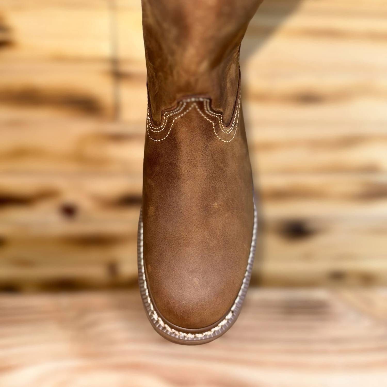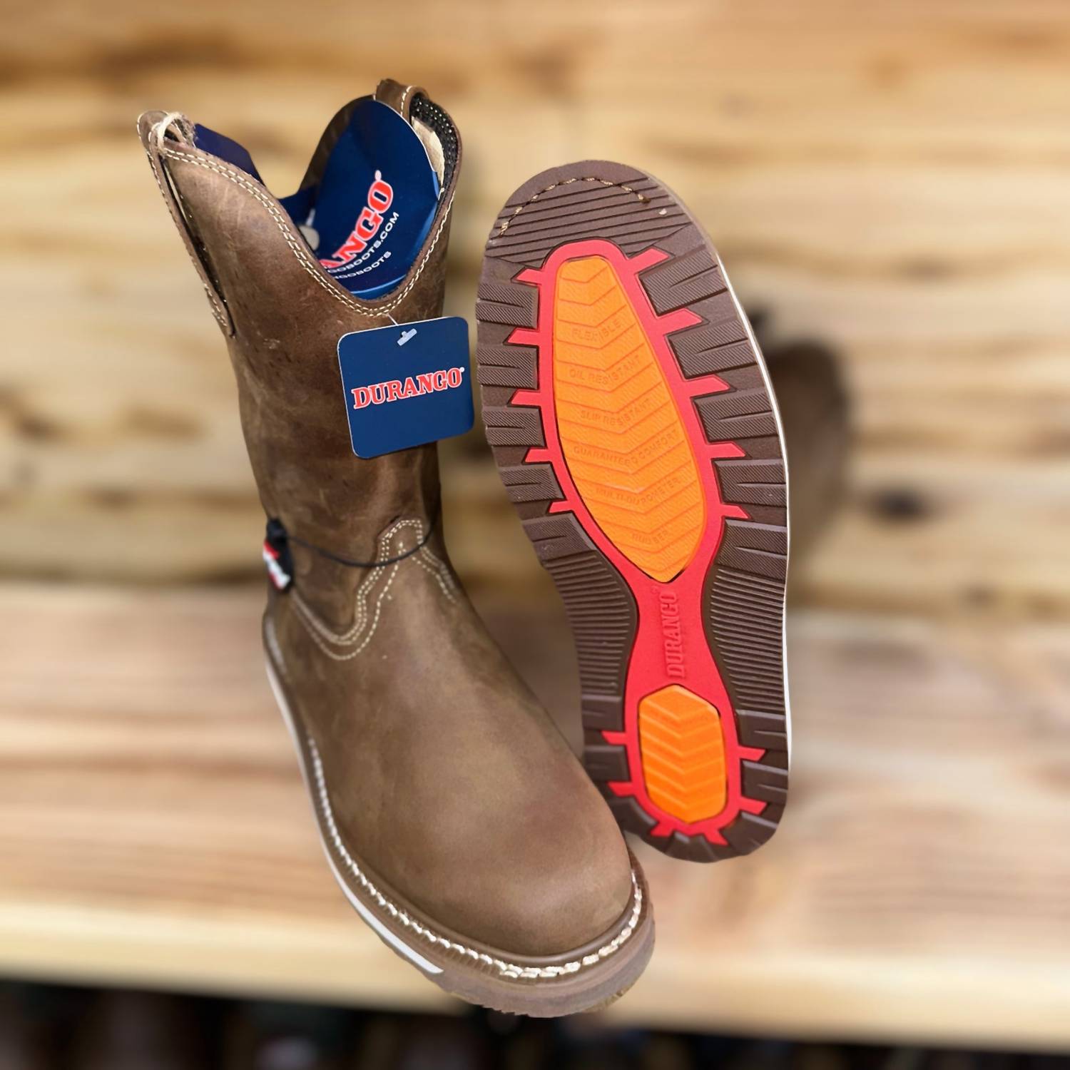 Introducing the Men's Maverick Western Wedge Work Boot by Durango Boots, an embodiment of durability and comfort crafted for today's hardworking individuals. These boots boast a full-grain leather upper in a rich brown hue, enhanced by the innovative Durango X-Pand System for a comfortable fit. Featuring a 1 1/4" heel, a padded collar, and a robust multi-durometer rubber outsole with high abrasion rubber outer lugs, these boots promise high-impact durability and slip, oil, and heat resistance. Soft mesh lining ensures breathability, while the all-around genuine Goodyear welt construction and blown oil-resistant rubber midsole offer superior longevity and performance.