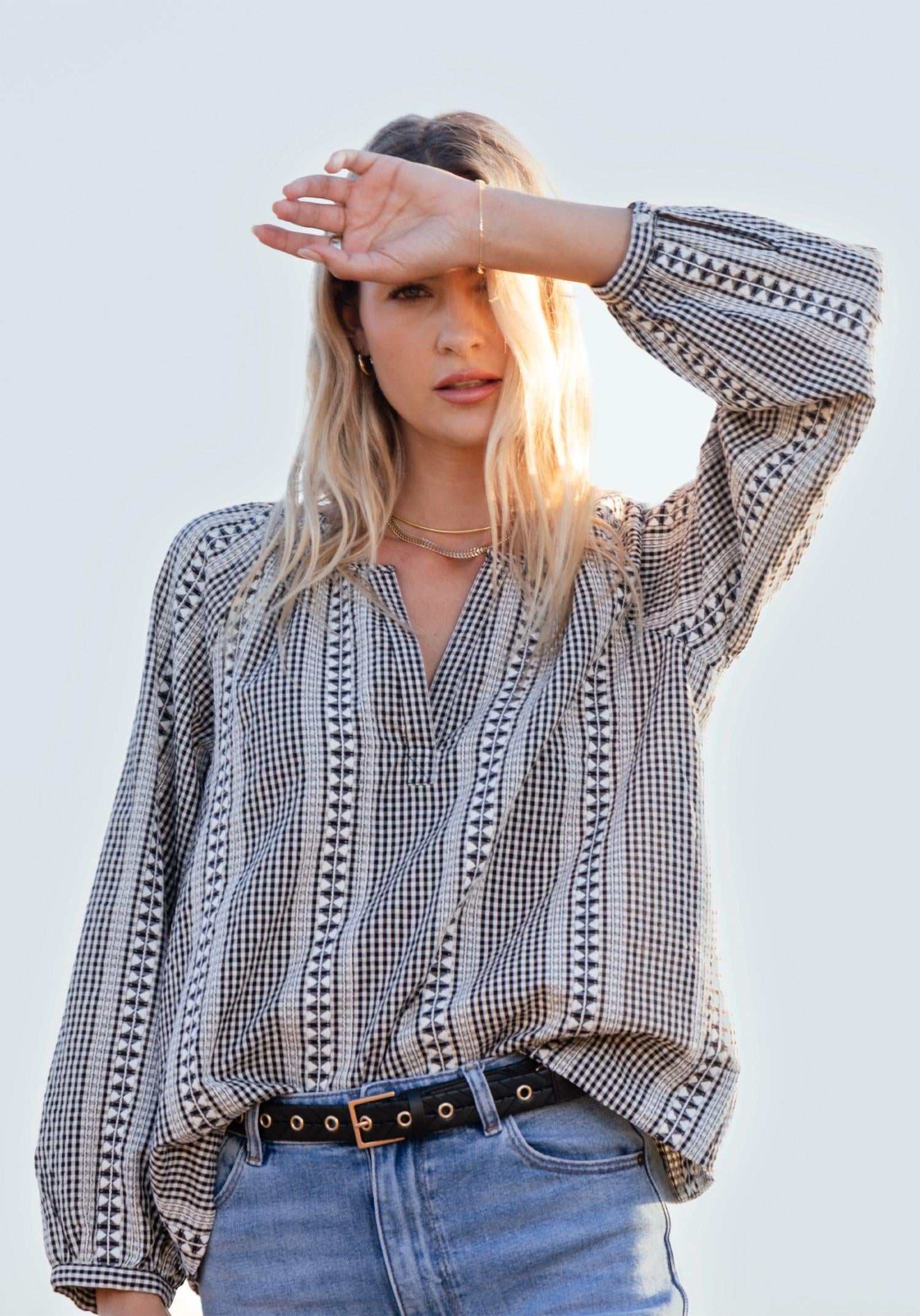 Discover the Bennet Blouse by Dylan, a boho chic addition to your summer wardrobe. Featuring elegant long sleeves and a v-neck design, this patterned blouse is crafted from 100% cotton for ultimate comfort and breathability. With a versatile pull-on closure, it's perfect for vacations or everyday style. Embrace effortless sophistication with this timeless black piece.