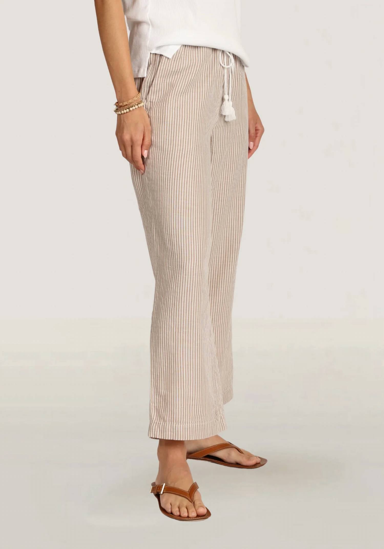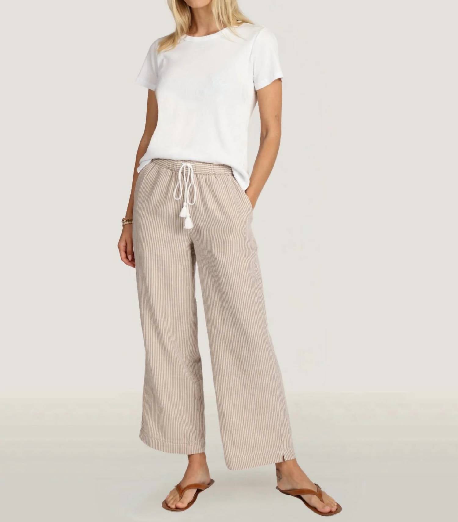Enhance your wardrobe with this trendy cropped number, designed to blend style and practicality. The comfortable fit allows for easy all-day wear. The perfect length to pair with your favorite mules. Embrace effortless style with the Driftwood Cropped Pant by Dylan, designed for the modern woman. These wide-leg pants feature a stylish stripe pattern in white and brown, crafted from 100% cotton for comfort. They include a practical zip closure and a drawstring waist for an adjustable fit. Ideal for your summer vacations, these pants lend a boho chic flair to any ensemble.
