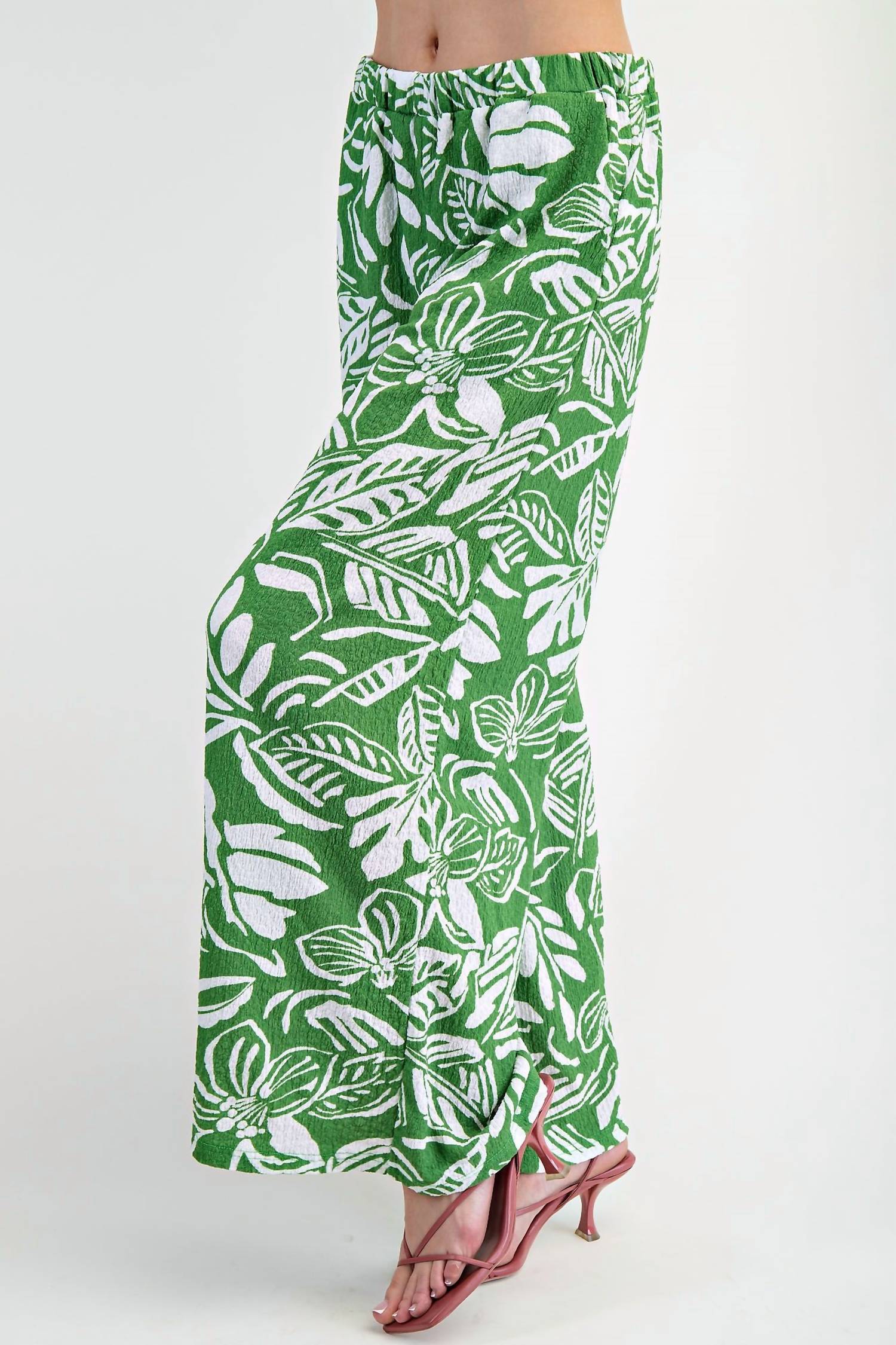 Step into tropical comfort with the Easel Plus Size Tropical Popcorn Knit Pants, perfect for a vacation-ready look. These pants feature a relaxed fit with a mid-rise elastic waistband and a generous 30" inseam, crafted from a soft popcorn-textured knit with a bold floral pattern in jungle green. The wide-leg silhouette and practical side pockets ensure both style and function. Closure: Pull on. Care: Machine wash cold, line dry.