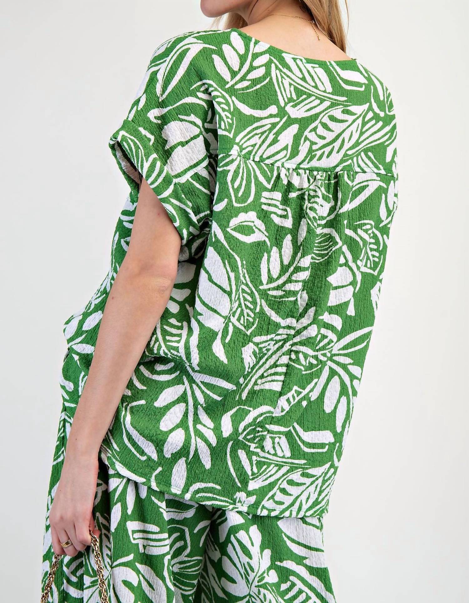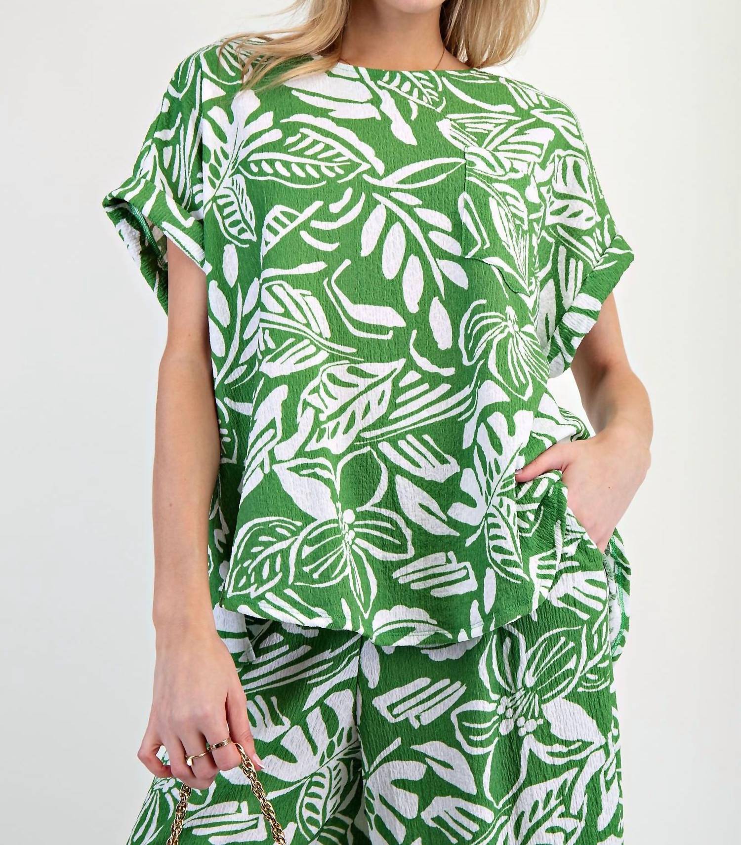 A timeless blouse that will never go out of style. Discover the Easel Plus Size Tropical Popcorn Knit Top in vibrant Jungle Green, perfect for vacation vibes with its maximalist tropical floral pattern. This blouse features stylish short sleeves with folded ends and a chic boat neckline, complemented by a practical front chest pocket. Crafted from 98% Polyester and 2% Spandex, this relaxed-fit, pull-on top also showcases a rounded hem that flatters every silhouette. Care is simple with machine wash instructions, making it an effortless addition to your summer wardrobe.