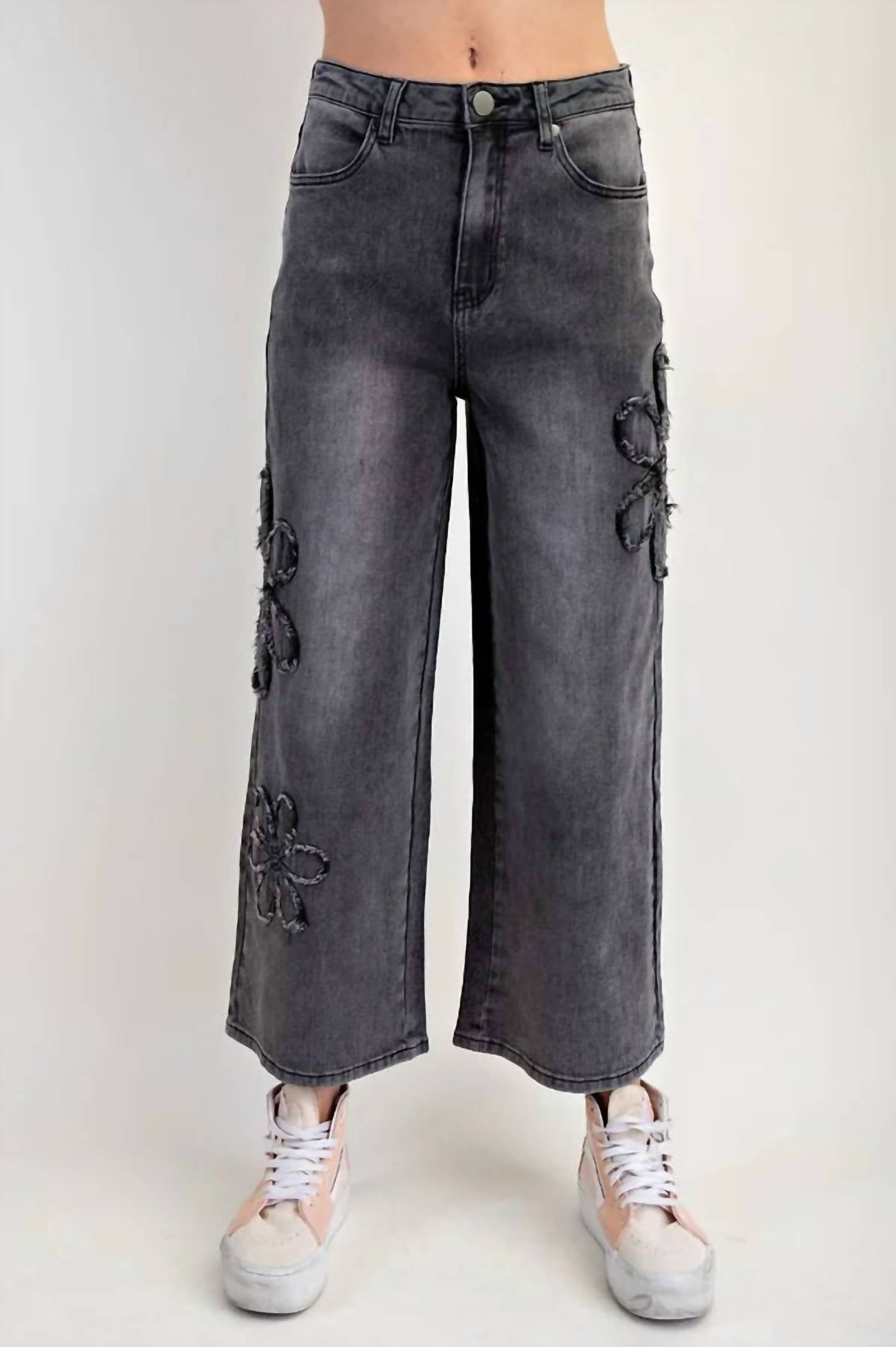 The Wide Leg Denim Daisy Stretch Pants by Easel offer a relaxed fit perfect for a streetwear-inspired look. Crafted from 75% Cotton 23% Polyester 2% Spandex, these black pants feature a graphic pattern and frayed flower patch detailing for a touch of whimsy. Details include a zip and button closure, belt loops, and both front and back pockets for functionality. Effortlessly care for these pants with machine wash and tumble dry instructions, making them an ideal choice for summer music festivals.