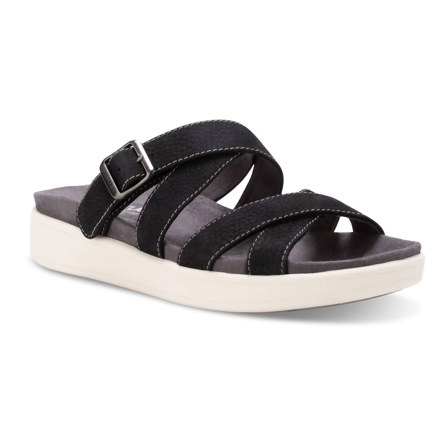 Step into style and comfort with the Women's Machias Buckle Slide from Eastland. Featuring adjustable straps for a custom fit, these sandals boast a leather or suede upper with micro-suede fabric lining for ultimate barefoot comfort. The contoured cushioned footbed and light rubber outsole provide all-day support and slip resistance, while the flat heel stands at 1 1/4 inches for a subtle lift. Ideal for game day or casual outings, these open-toe beauties ensure durability and timeless style.