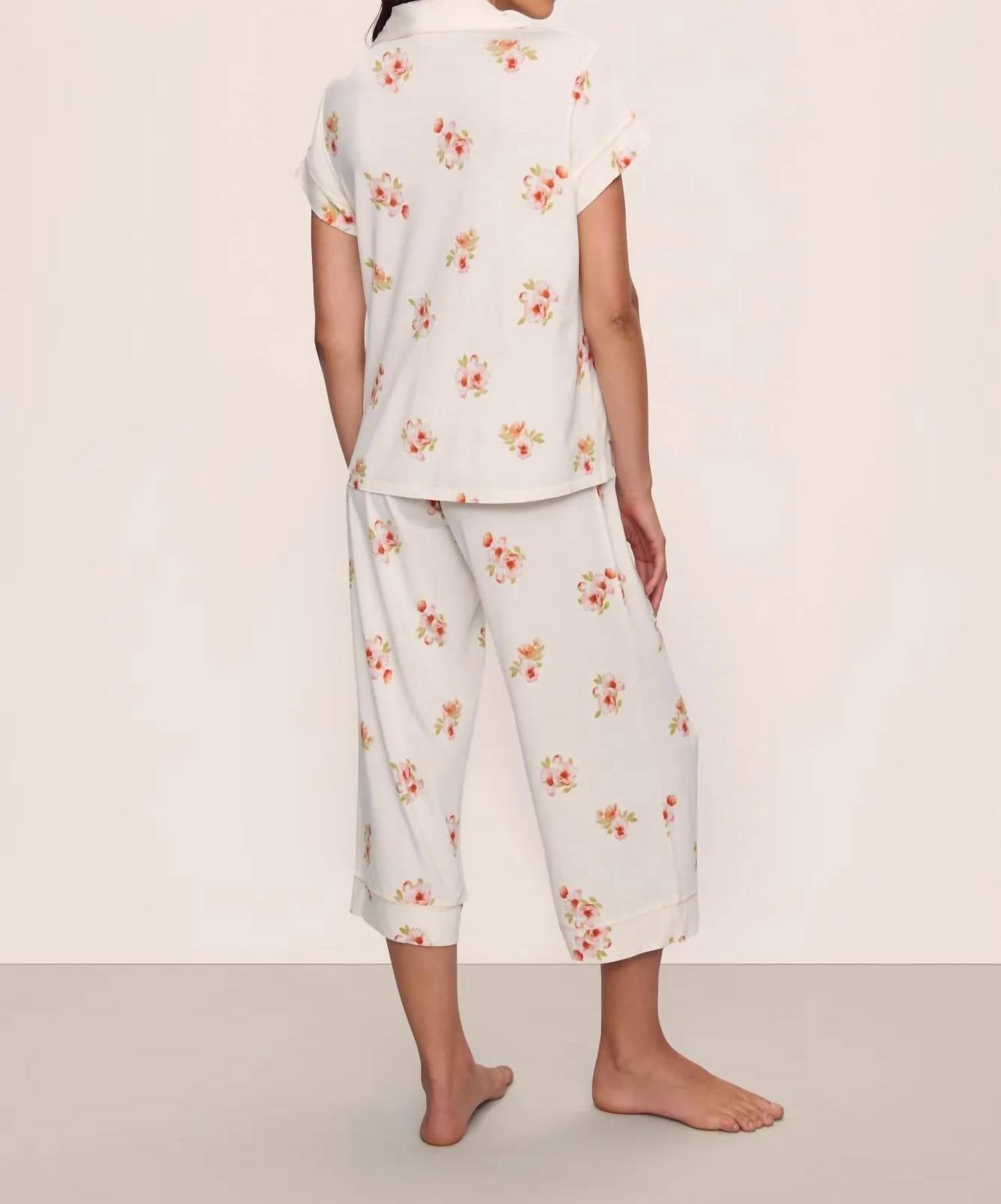 A match made in heaven. This two-piece set is so cute, you'll wish you could wear it out of the house! Did we mention how comfortable it is, too? You may want two sets! The Eberjey Gisele Short Sleeve Crop PJ Set is a charming choice for leisurely days, exuding softness and style. With short sleeves and a flattering collar, this set is crafted from luxurious Modal material, showcasing a delightful Floral Bloom Ivory and Vanilla Cream pattern. Machine wash and tumble dry. 95% TENCEL™ Modal, 5% Spandex.
