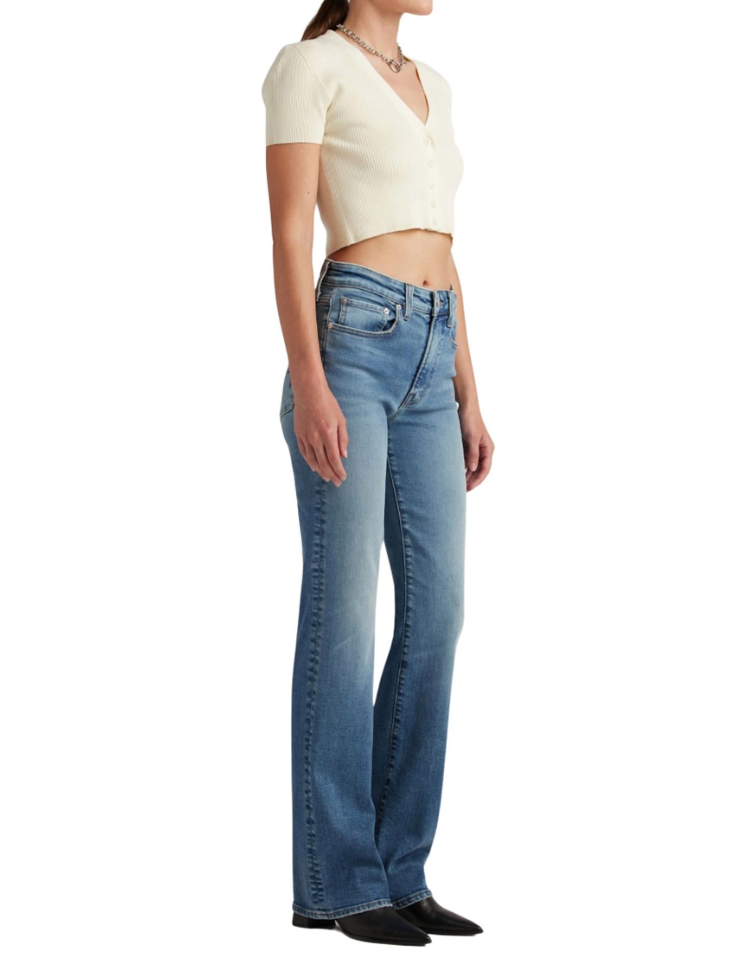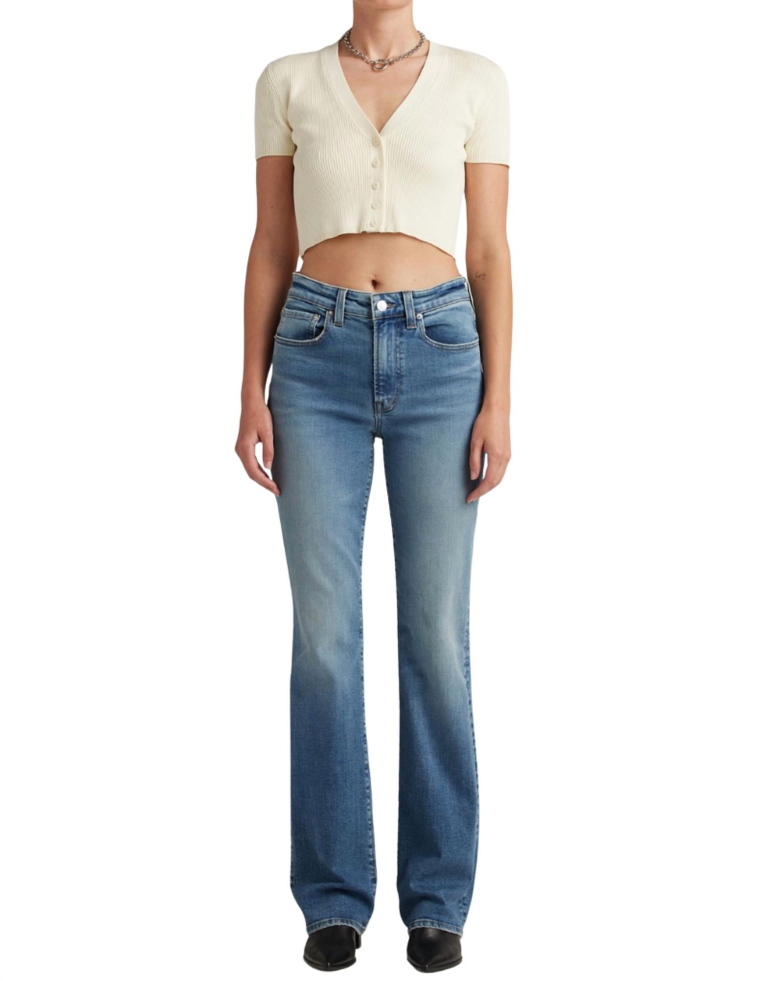 A flattering silhouette that's suprisingly versatile. Presenting the Women's Lark Jean by EDWIN in a stylish Flashback hue, crafted from a superior cotton blend for comfort and style. These high-rise, regular fit jeans feature a classic flared leg design, complete with a button closure for secure wear. The medium wash denim showcases a solid pattern, offering a snug fit through the hips and thighs with a graceful break at the knee. With a front rise of 9 1/4", a leg opening of 19 1/2", and an inseam of 33", this versatile pair is perfect for travel and summer occasions.