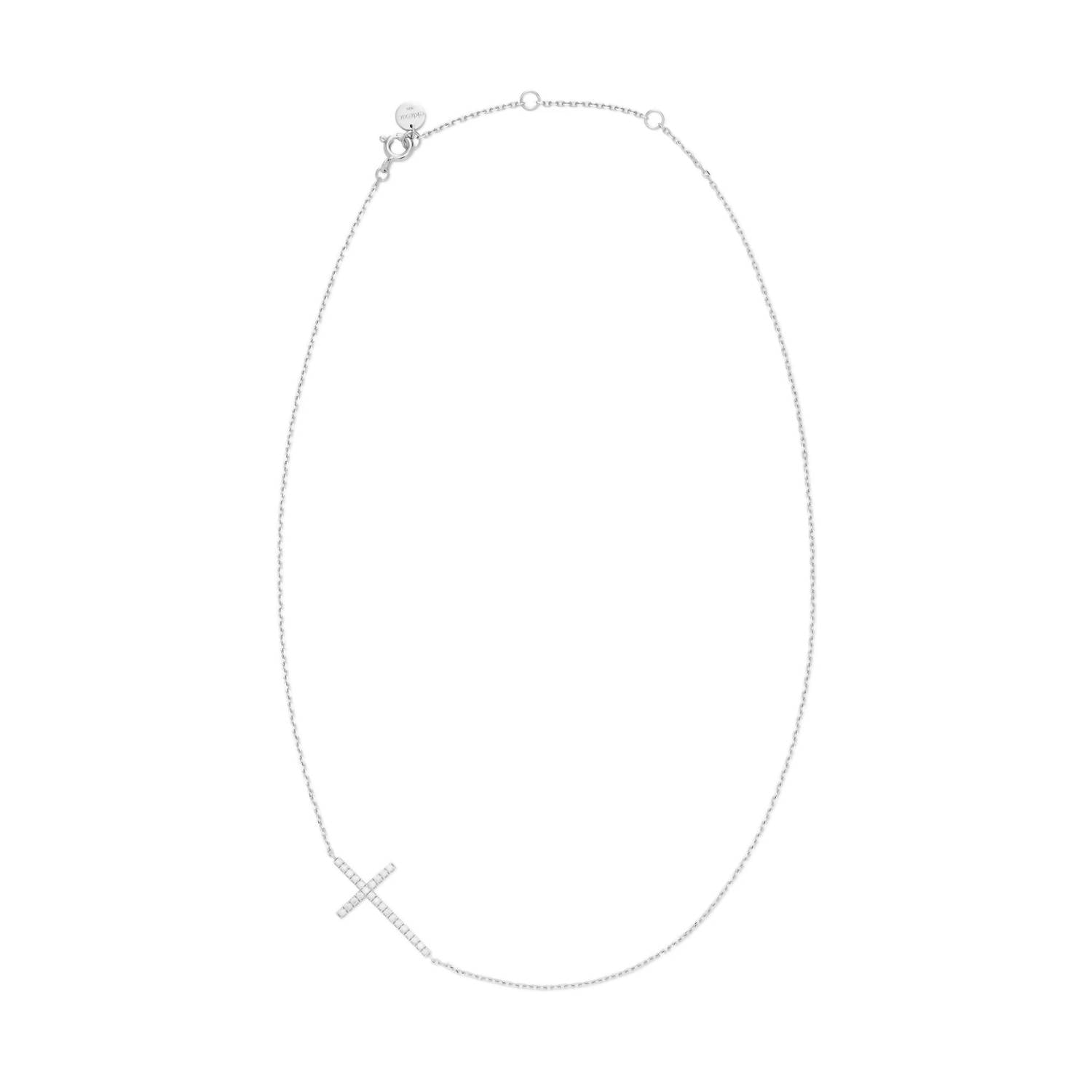 Introducing the Women's Horizontal Cubic Zirconia Cross Necklace by eklexic, a fine piece crafted for elegance and allure. This rhodium-plated sterling silver necklace features a 1-inch horizontal cross adorned with 25 pieces of 1.4mm Cubic Zirconia. The design includes a luxurious 14K gold plated ecoat and a 1.2mm width cable chain, adjustable from 16 inches with a 2-inch extension for a perfect fit. Closure: Lobster clasp. Perfectly suited for any occasion, adding a touch of sophistication to your style.