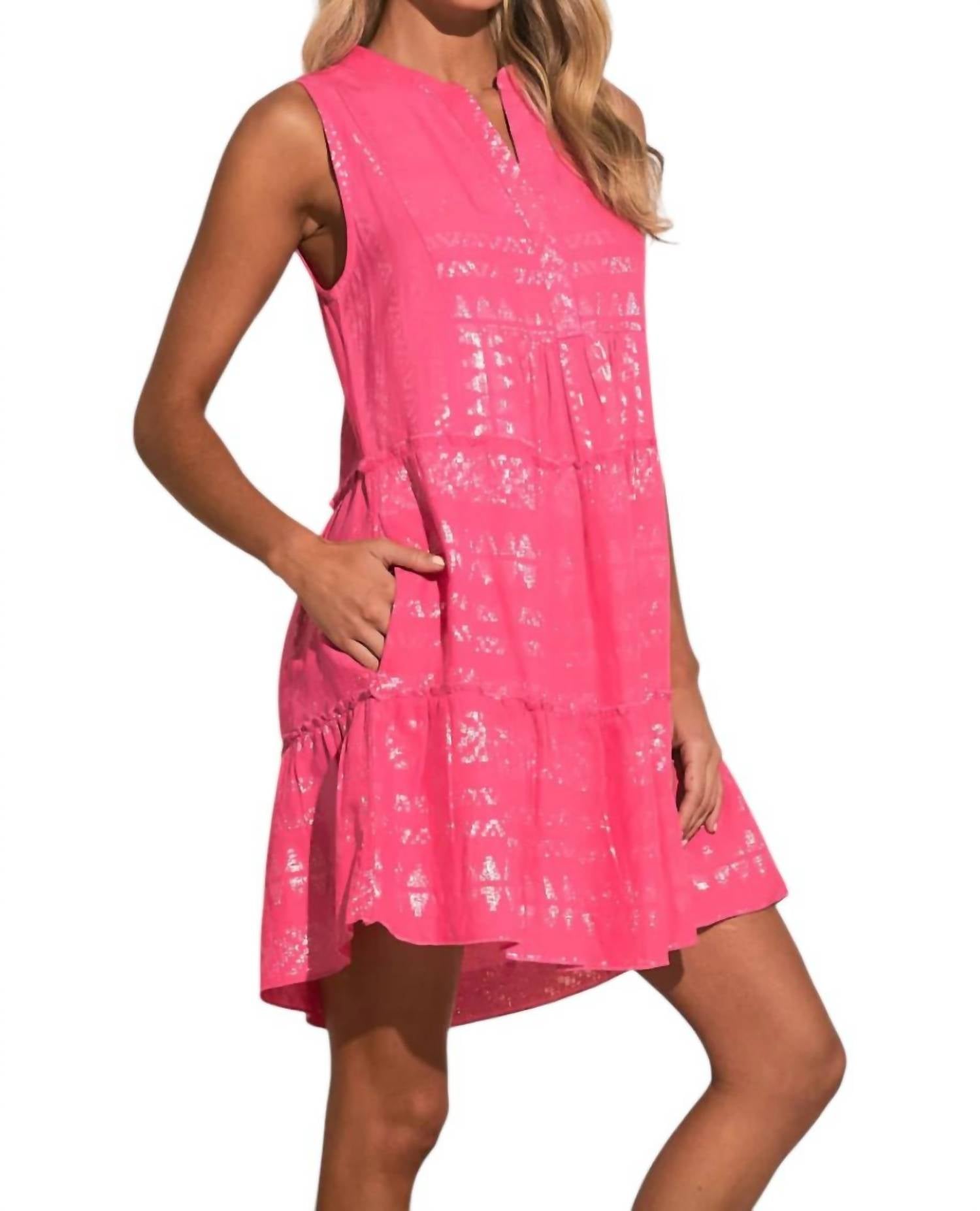 The perfect mini dress for those warmer months. This mini dress features a light-catching jacquard pattern, a hidden-button half-placket, and a band collar. It is sleeveless with side-seam pockets and is unlined. Made from 47% cotton, 47% viscose, and 6% metallic fibers. 34" length (size Medium). Hand wash.
