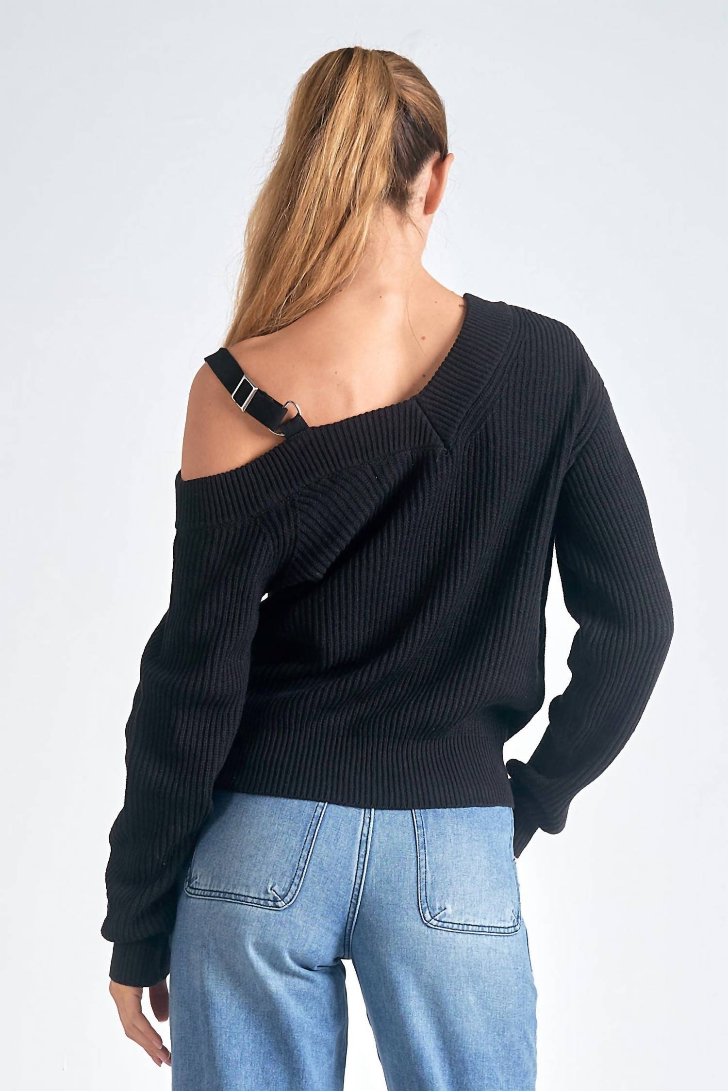 Asymmetrical Off Shoulder Sweater. 55% Cotton, 45% Acrylic. Adjustable strap.