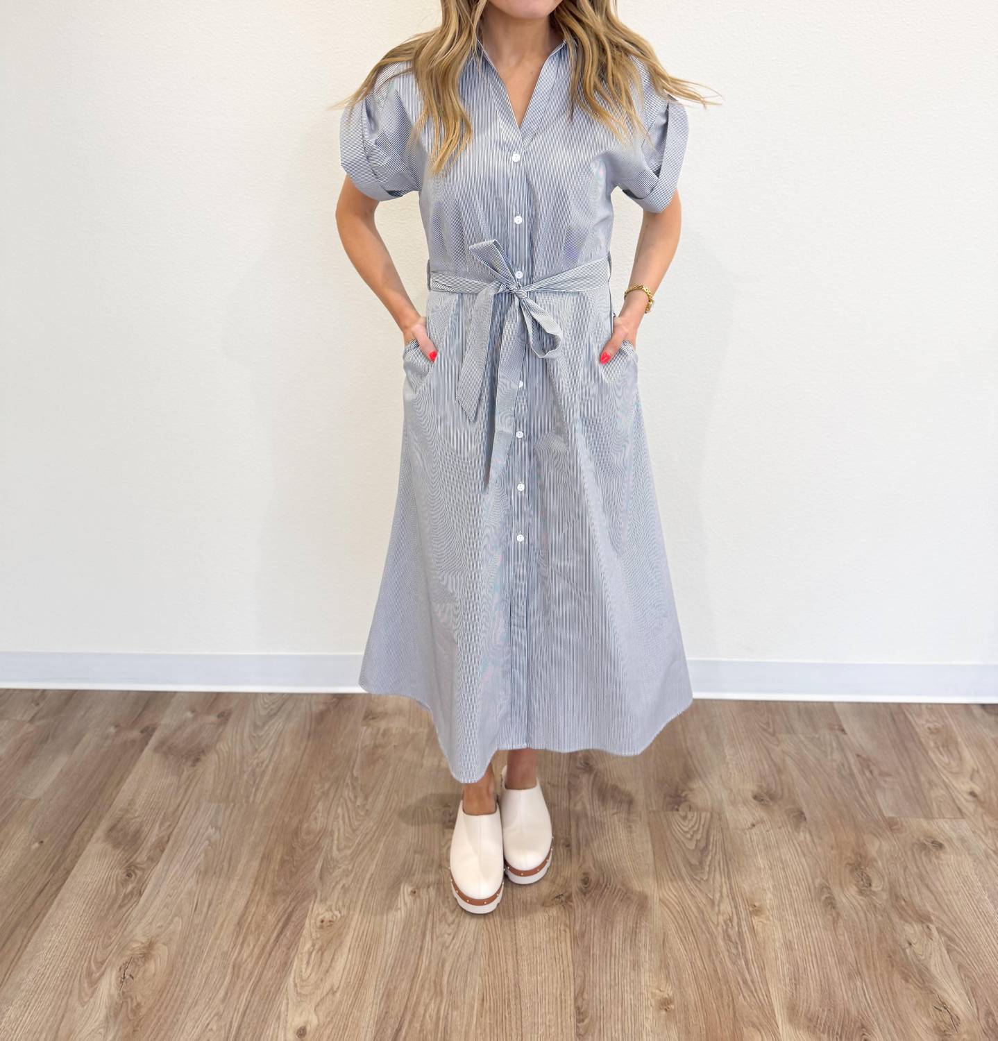 The perfect length dress does exist. Introducing the Billie Button Midi Dress by ELAN, a playful yet elegant addition to any wardrobe. This A-line dress features short rolled sleeves and a chic button closure, enhanced by its Oxford collar. Crafted with a striking blue and white stripe pattern, this midi-length dress includes convenient pockets. Designed for effortless style and comfort, it is ideal for holiday parties or casual summer events. Wash instructions: Machine wash. Shaina is wearing size Small.