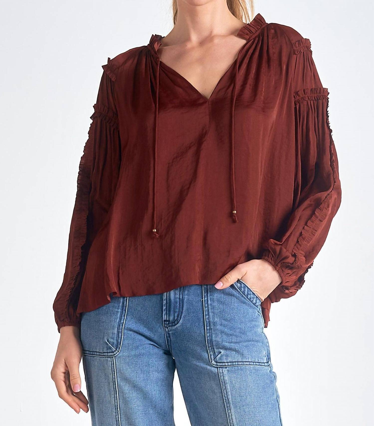 A timeless blouse that will never go out of style. Meet the Brick Heather Top by ELAN, a boho-inspired blouse in a striking red/brown hue, perfect for adding flair to your ensemble. This long sleeve top boasts charming ruffled accents and ties that elegantly fall from the V-neckline, ensuring a stylish finish. Made from 100% Polyester for lasting comfort and featuring a convenient pull-on design, it aligns perfectly with the 90s fashion trend. Care instructions include a gentle hand wash for maintaining the top's quality.