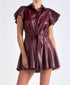 Experience the Butter Ruffle Mini Dress by ELAN, where edge meets femininity effortlessly. This fit and flare dress, crafted from polyester, features short fluttering sleeves and a commanding button closure. The daring faux leather design includes a tie belt detail, all in a sleek black color. Model is wearing a size small (5'11" height, 34" bust, 24" waist, 36" hips).