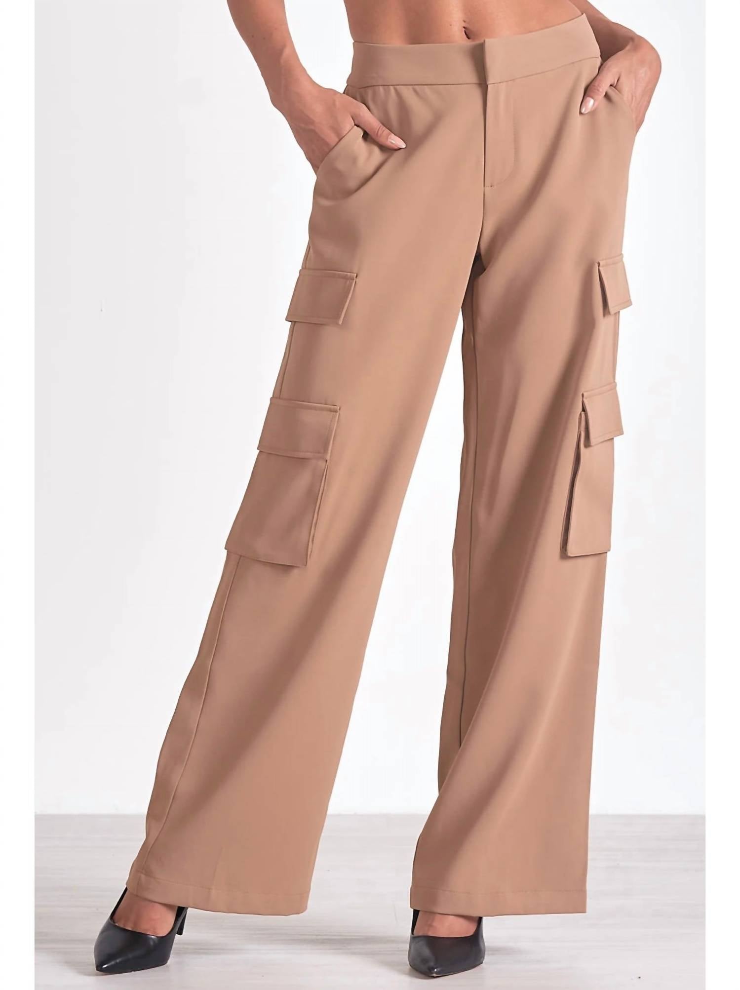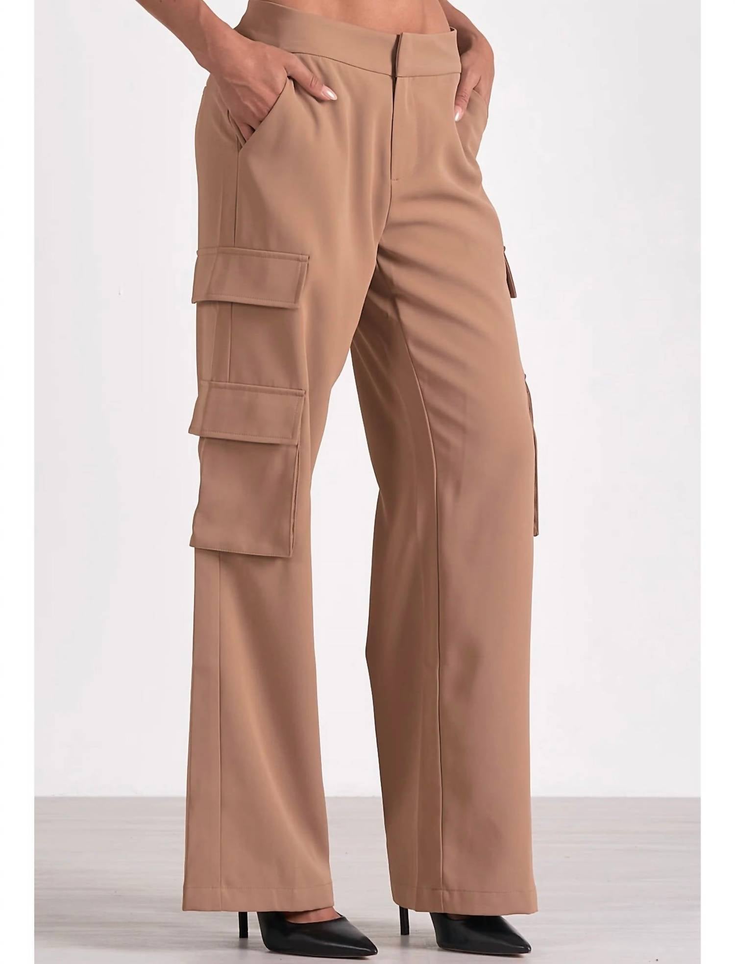 Discover the ELAN TAN CARGO PANTS, the essential piece your wardrobe needs this season. These trousers offer a relaxed fit with a high-rise waist and a wide-leg style, all in a solid tan hue. Crafted from durable polyester, they feature convenient pockets and a secure hook and eye closure. Care is a breeze with machine wash and tumble dry instructions.