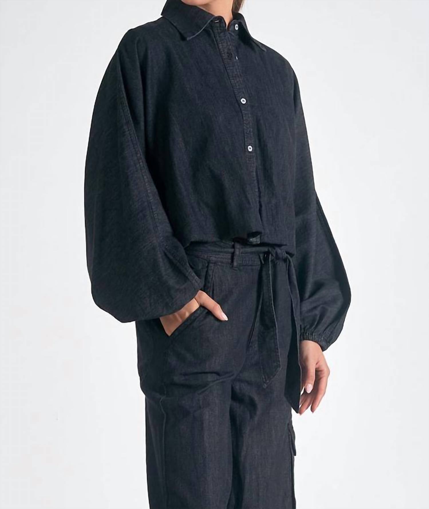 Introducing the ELAN Cheri Blouse, a stylish black button-down with bubble long sleeves to enhance your playful, quirky look. Crafted from 100% cotton, this cropped blouse includes unique elastic sleeve details for that touch of flair. Closure: Button closure. Care: Hand wash lukewarm and warm iron as needed.