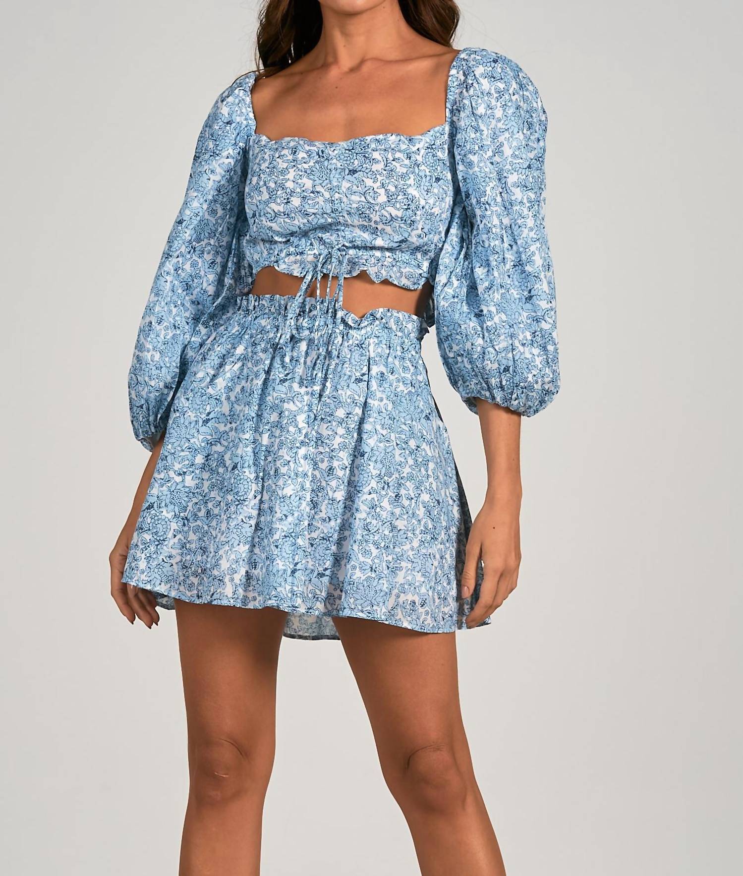 Show a little skin in this cute and casual crop top. This light blue and navy floral skirt has side pockets, a fully lined interior, and an elastic waistband. It is easy to put on and suitable for casual summer days. Pair it with the denim Santa Fe Cinched Blouse by Elan for a complete outfit.