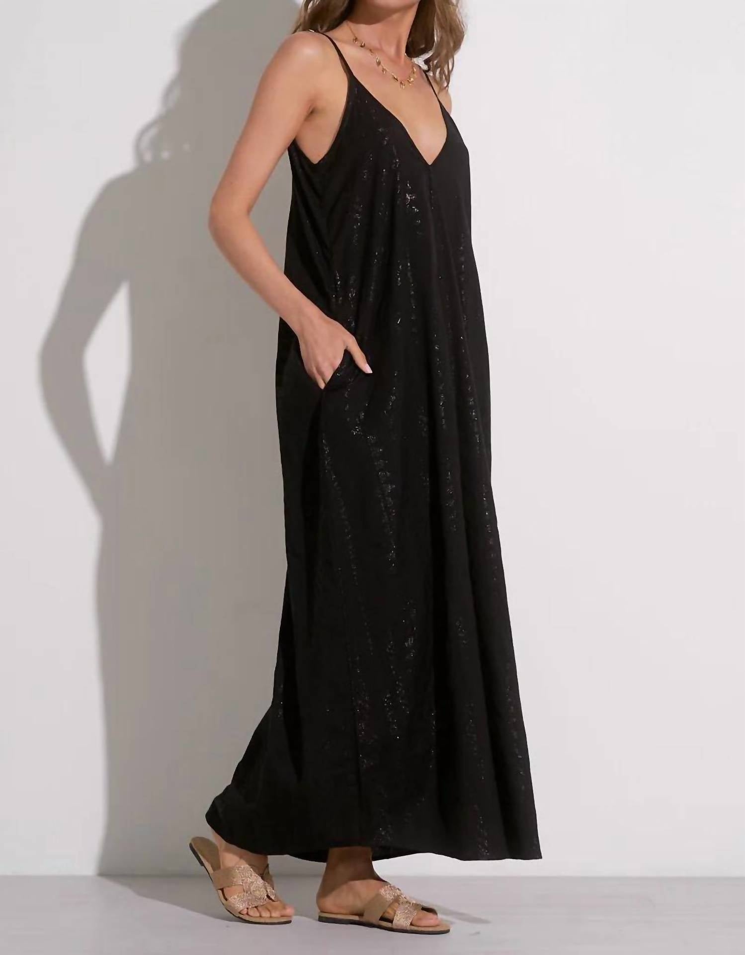 Who doesn't love a good maxi dress? This one you'll be reaching for season after season. The Cleo Spaghetti Strap Maxi Dress by ELAN is a vacation staple with its adjustable spaghetti straps and long-line, minimalist silhouette. Made from a blend of 47% Cotton, 47% Viscose, and 6% Metallic, it features cozy pockets for added convenience. This black textured dress has a pull-on closure and a V-neckline, perfect for summery Mother's Day getaways. Care instructions are missing, but the model is 5'9" with a bust of 32", waist of 23.5", and hips of 33.5", wearing a size small that runs true to size but may be roomy in the chest.