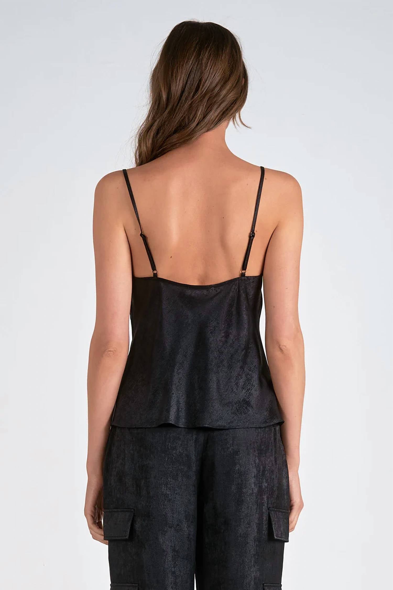 Throw this on with your favorite blazer for a more polished look. Elevate your look with the Cowl Neck Shimmer Cami Top by ELAN, a glamorous choice in a sleek black satin. This camisole features elegant spaghetti straps and a sophisticated cowl neckline, offering a chic and sophisticated style. Composition: 100% Polyester. Closure: Pull-on. Care: Hand wash and lay flat to dry. Ideal for adding a touch of luxury to your ensemble.