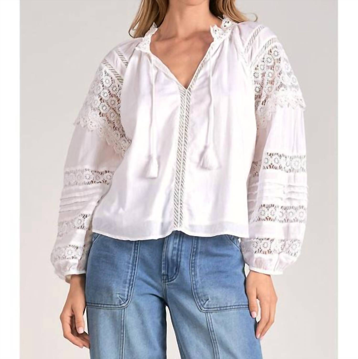 A timeless blouse that will never go out of style.Worn tucked in or out, this top will become a favorite. Long sleeves with crochet panel inserts. Tie neck with tassel ties. Eyelet trim around the neck. Crochet trim down center front. 100% Cotton. True to size. Comfortable and relaxed fit. Hand wash cold. Line dry.