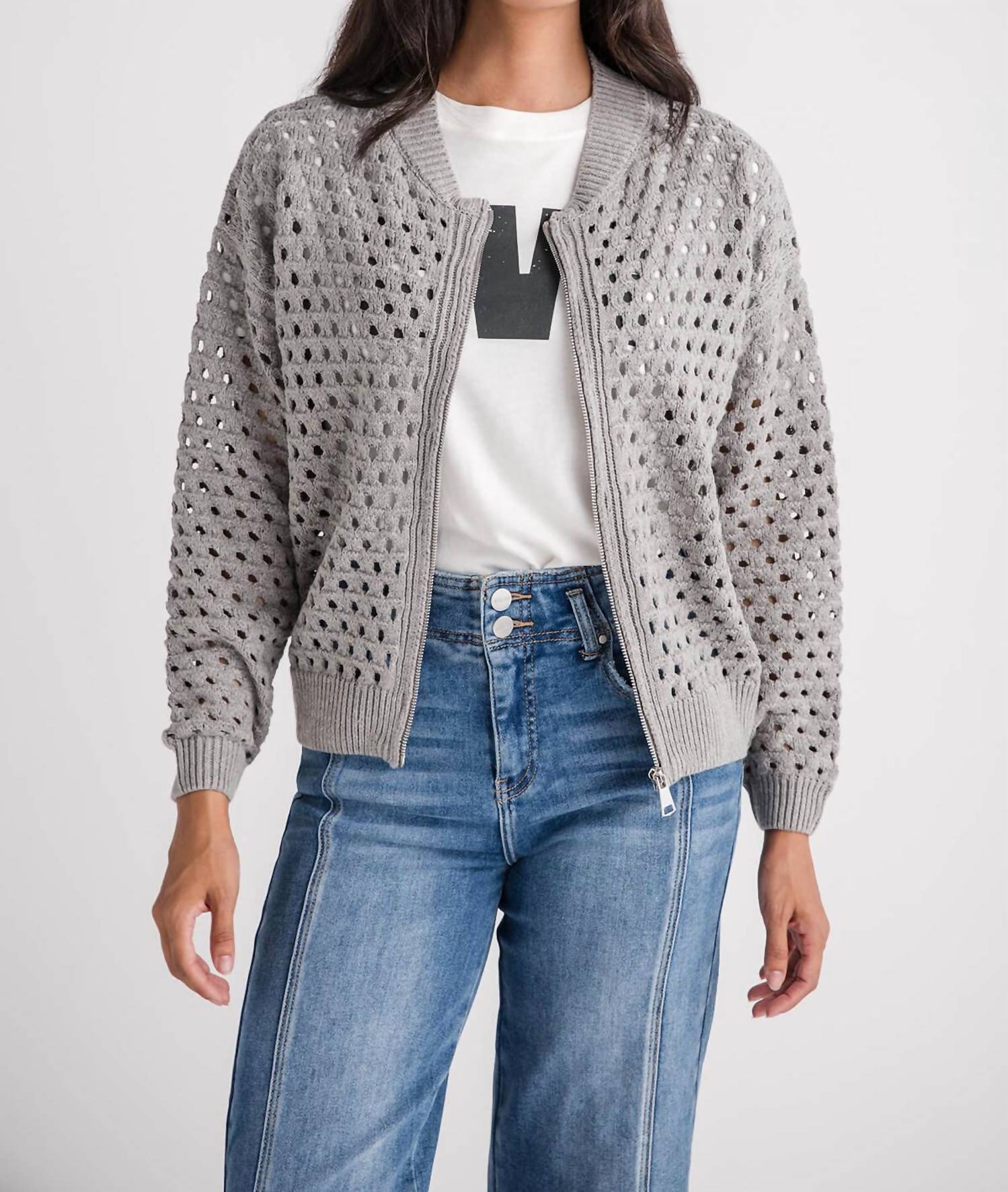 The Crochet Zip Cardigan by ELAN is a beautifully patterned piece in versatile gray, perfect for adding a touch of elegance to your wardrobe. Made from cotton, this women’s cardigan features long sleeves and a stylish V-neck. It offers a practical zip closure for ease of wear and layering. Care is simple with machine wash instructions provided.