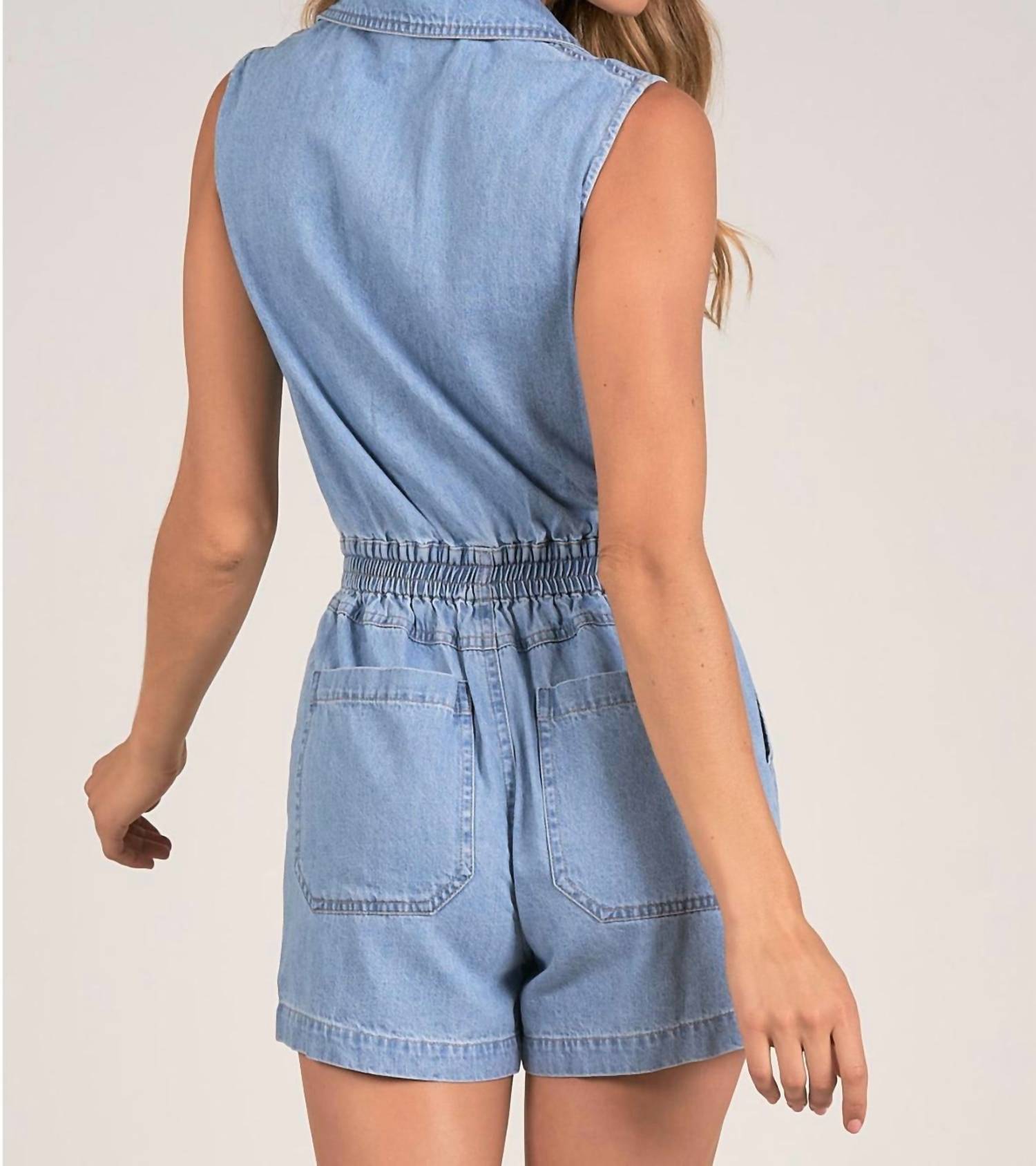 The perfect outfit choice when you you need something quick to throw on and still want to look efforlessly cool. Step out in effortless streetwear style with the Elan Denim Sleeveless Romper in a chic blue wash. Crafted from 100% cotton, this solid light wash romper features a sophisticated collar neckline and a practical zip closure. Ideal for summer vacations or casual outings, it boasts convenient pockets for added functionality. Care for your garment is simple with machine wash and tumble dry instructions, making it a go-to piece for laid-back elegance.